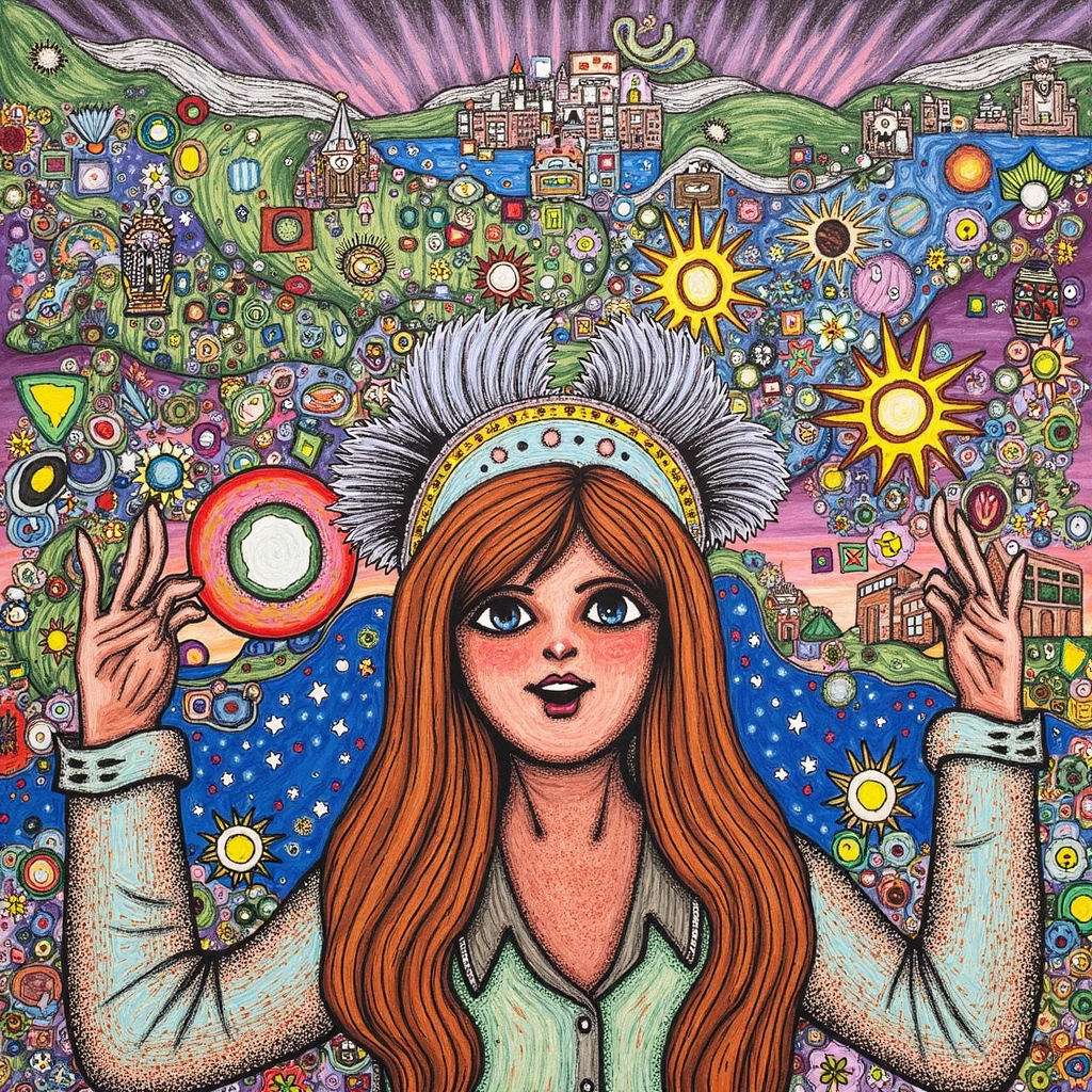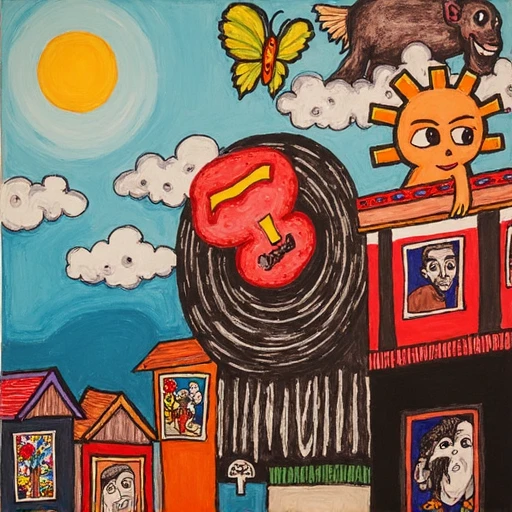 Whimsical narrative elements—tiny suns, butterflies, cassette-tape clouds—woven into the chaos
