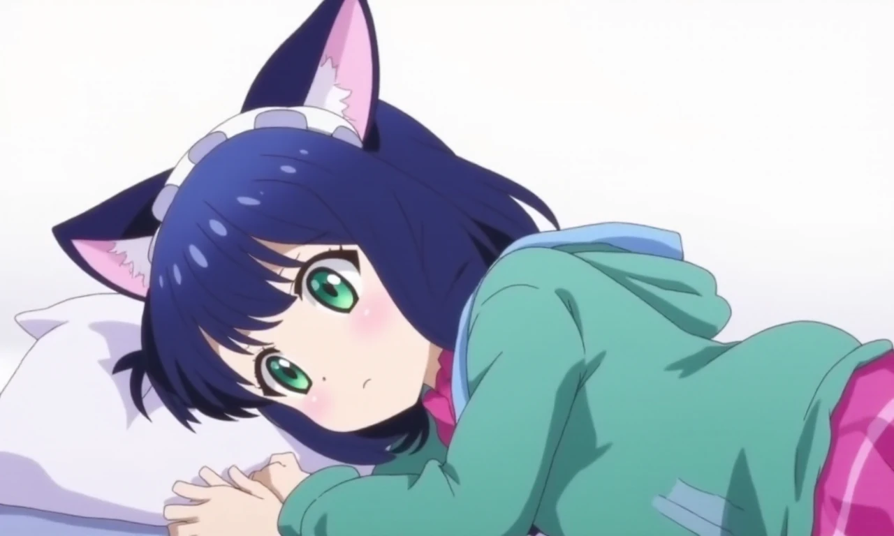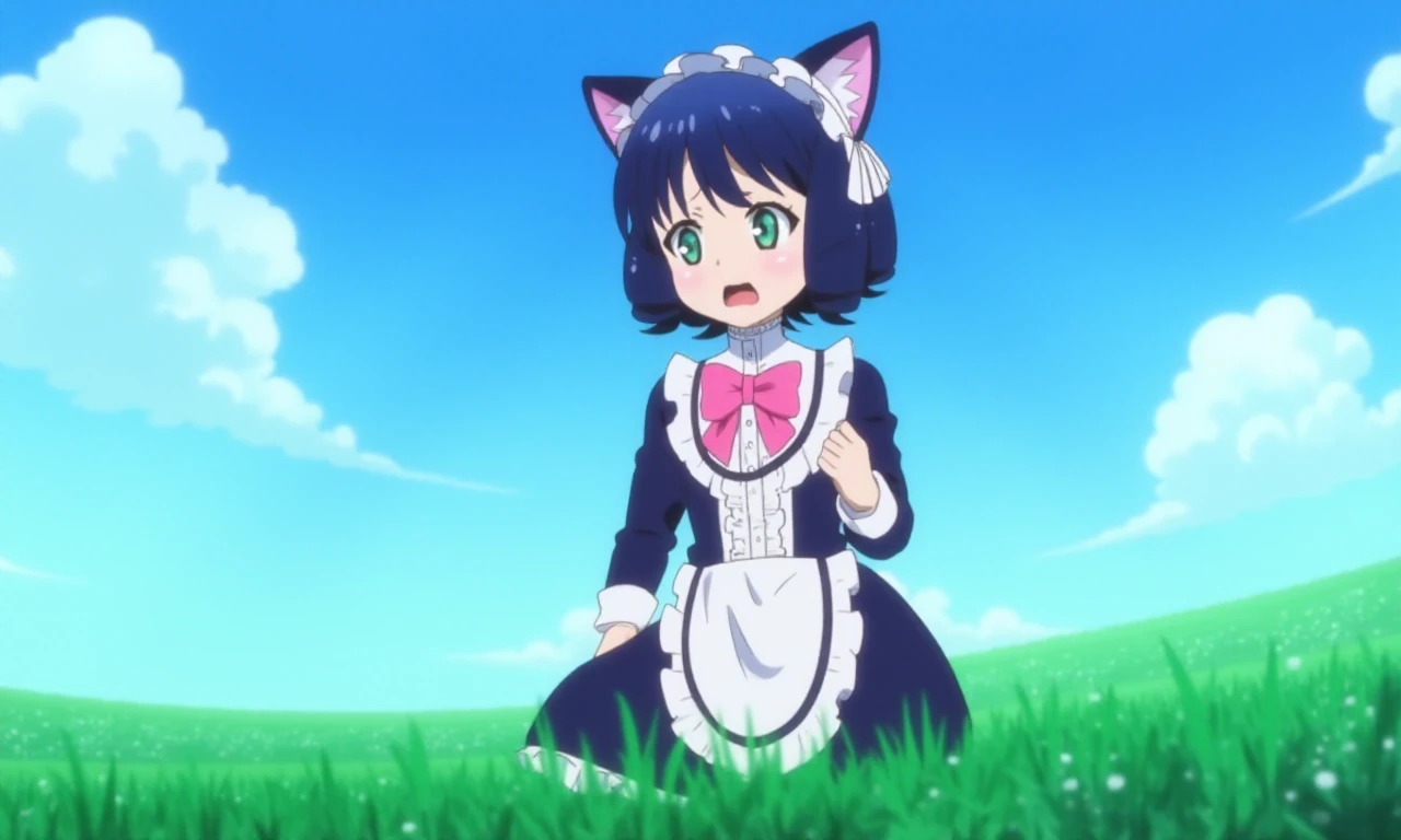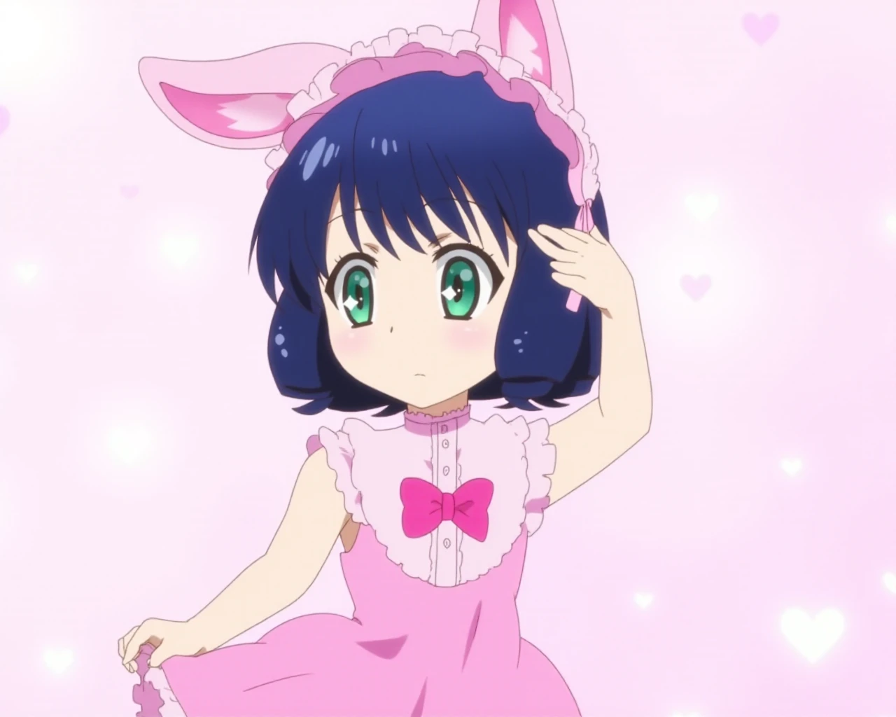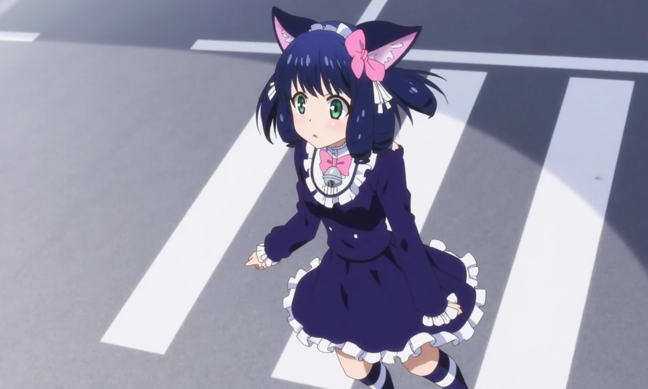 c14n girl with dark blue hair and green eyes walking on the street, dark purple dress, pale pink bow with a silver bell, skirt has white multi-layered frills, navy blue and white striped stockings,