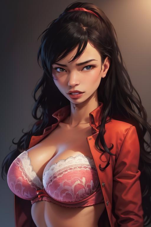 Open Jacket: 1girl, Old Cixi, long hair, open shirt, bra, red jacket