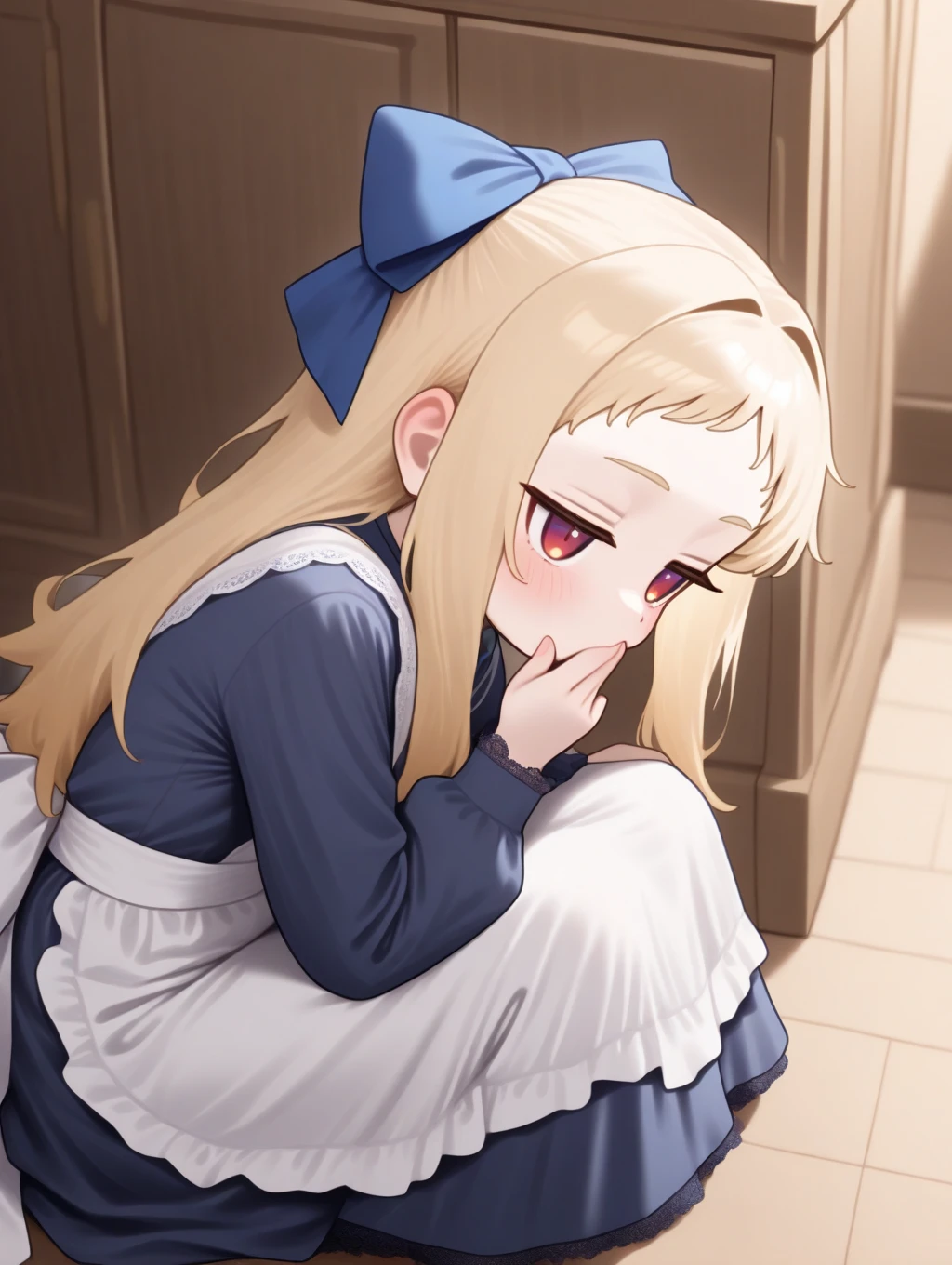 akua,blonde hair,long hair,red eyes,dark blue dress,hair ribbon,apron,blue ribbon,long sleeves,lace trim,large bow,jitome,ziggy short bangs,