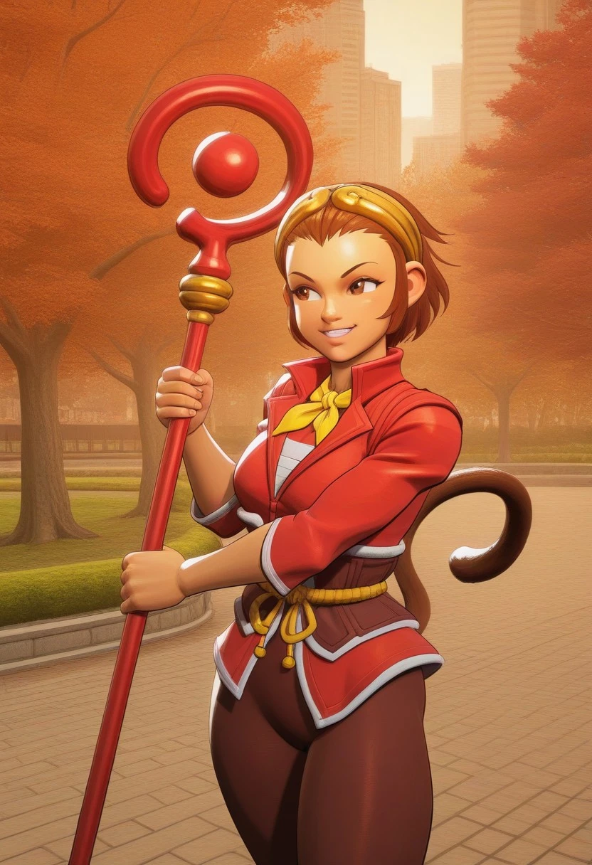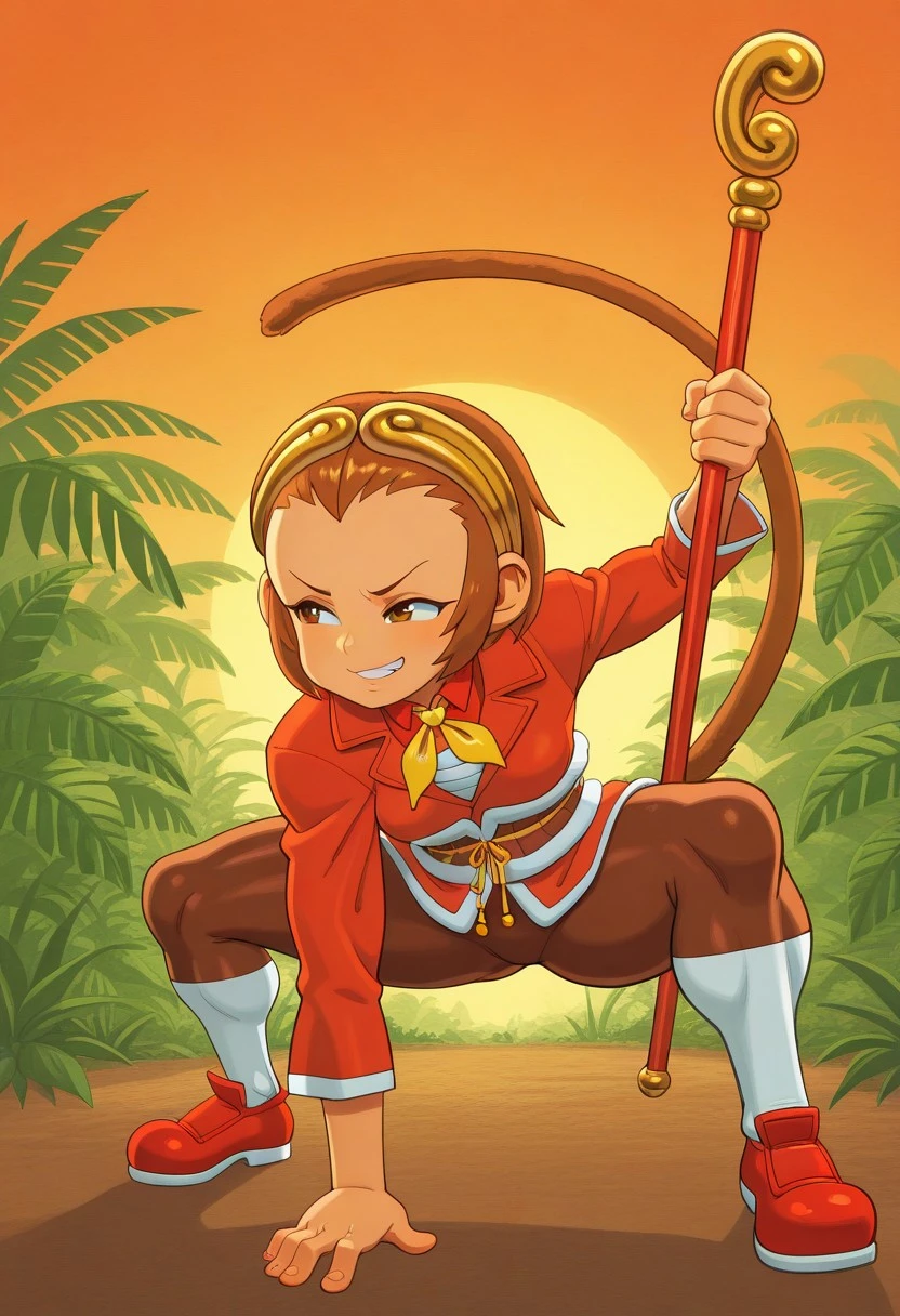 Sonson, brown hair, brown eyes, red collared shirt, yellow necktie, brown sash, black leggings, brown monkey tail, red shoes, holding staff