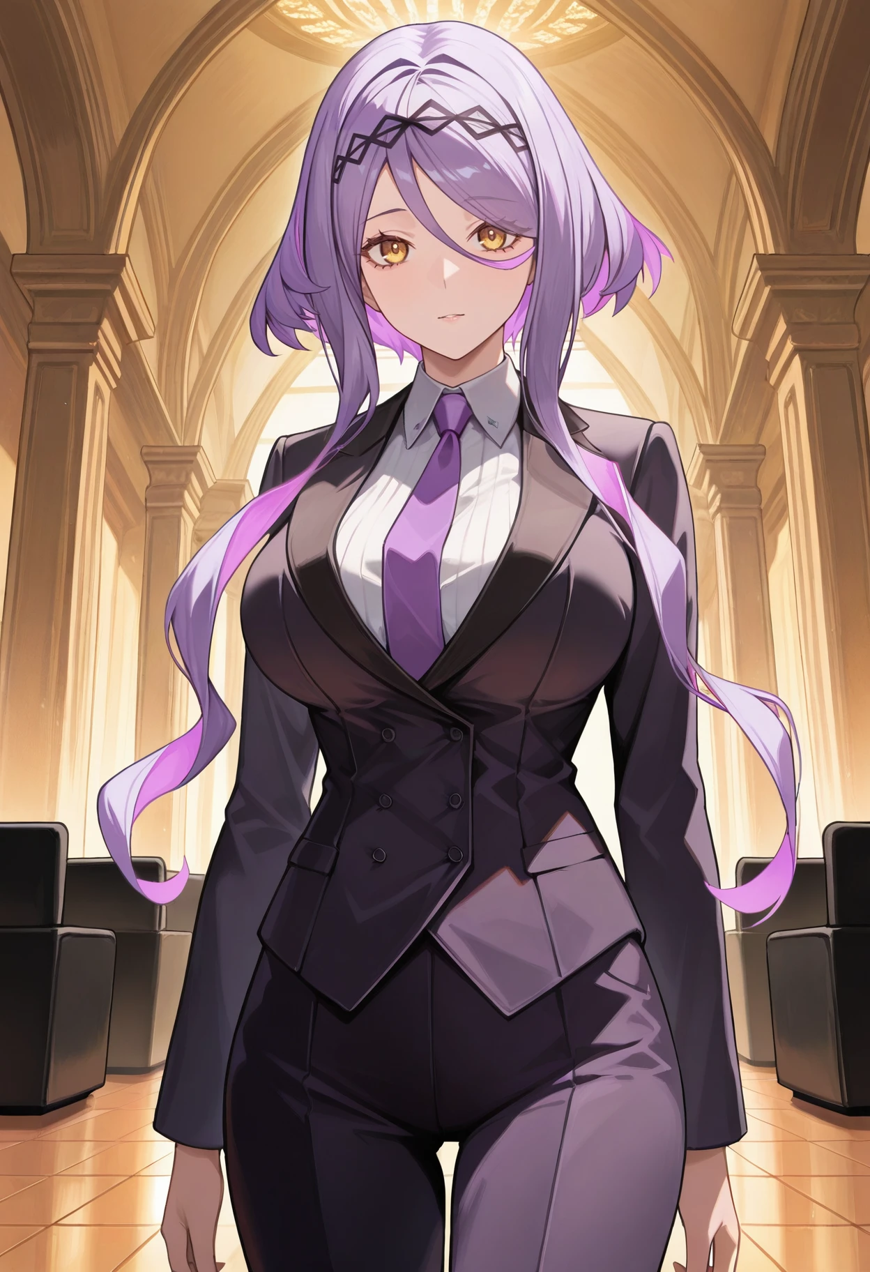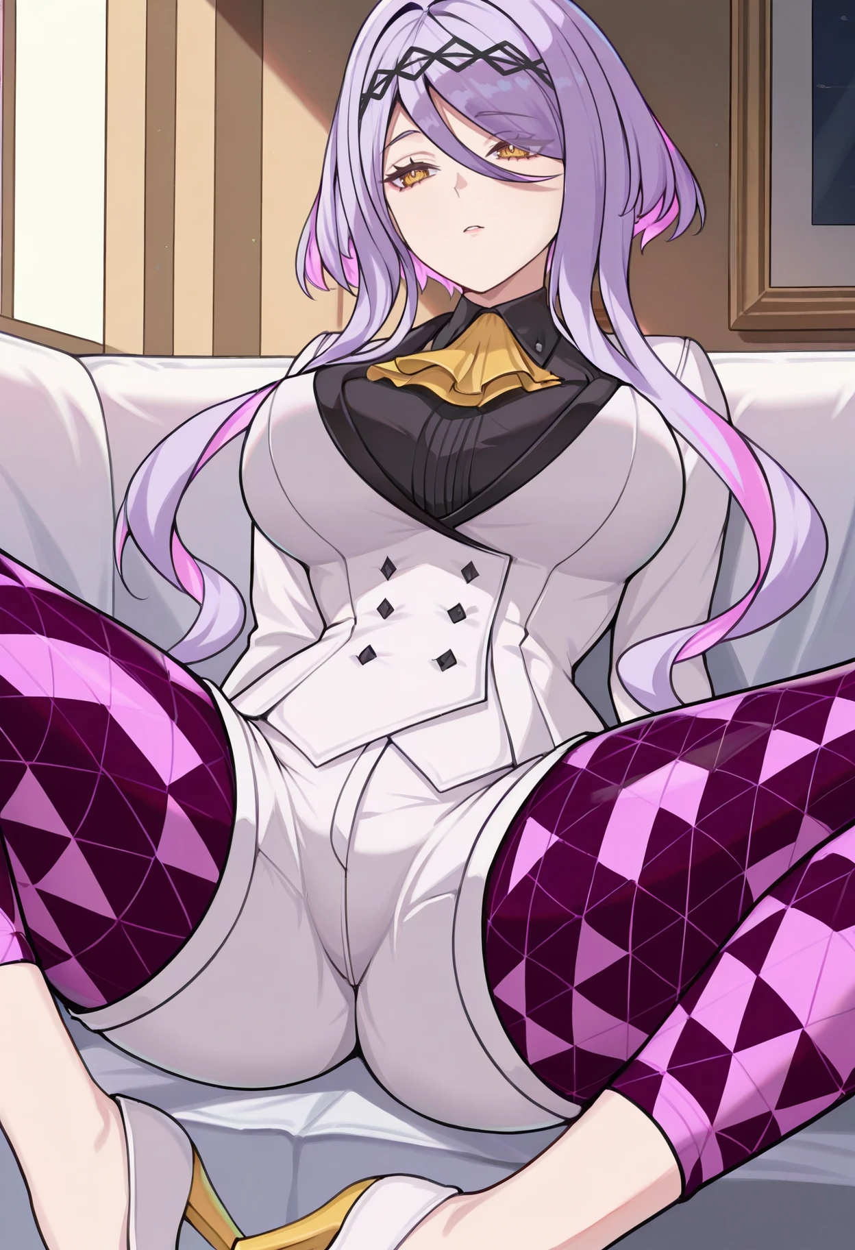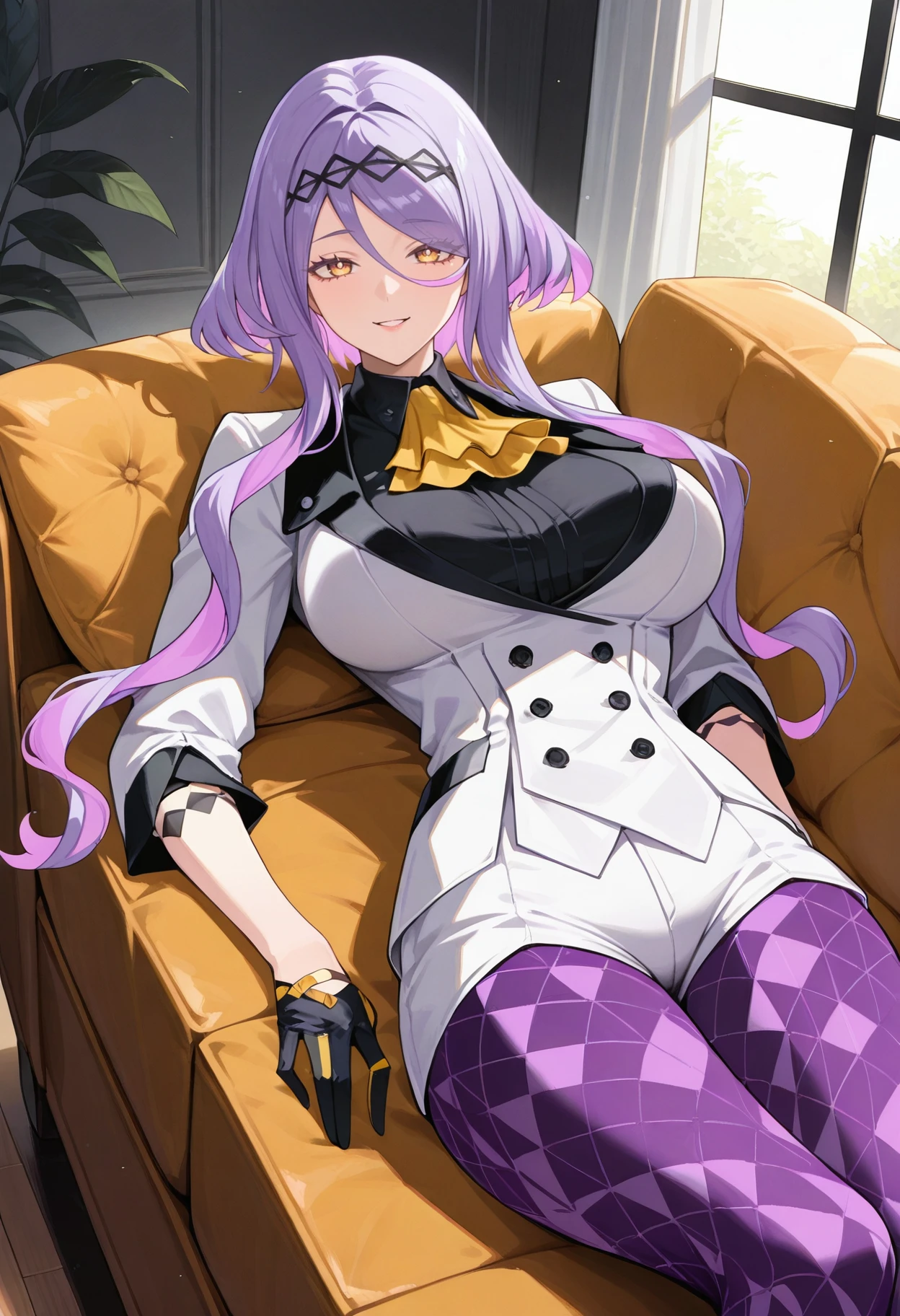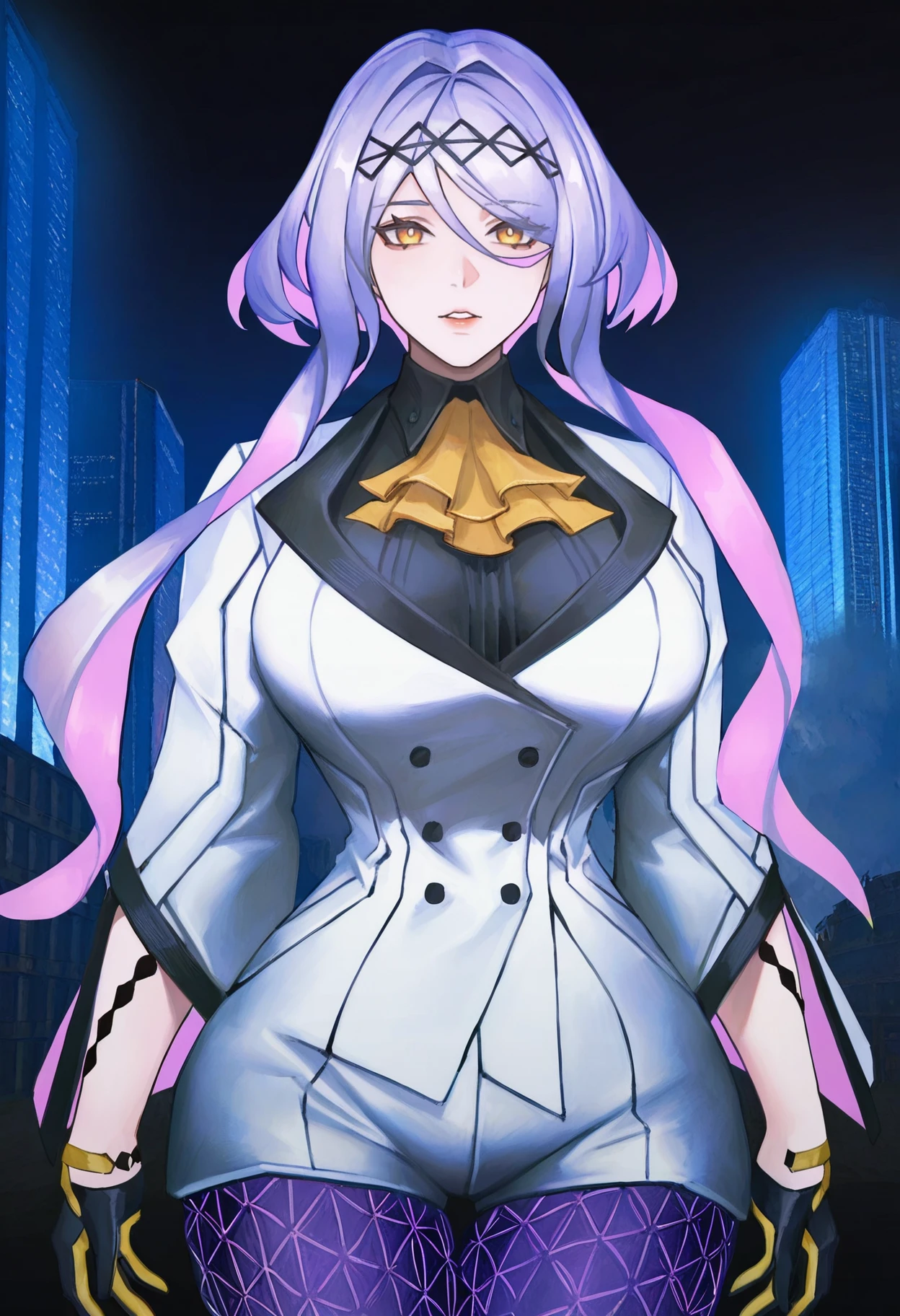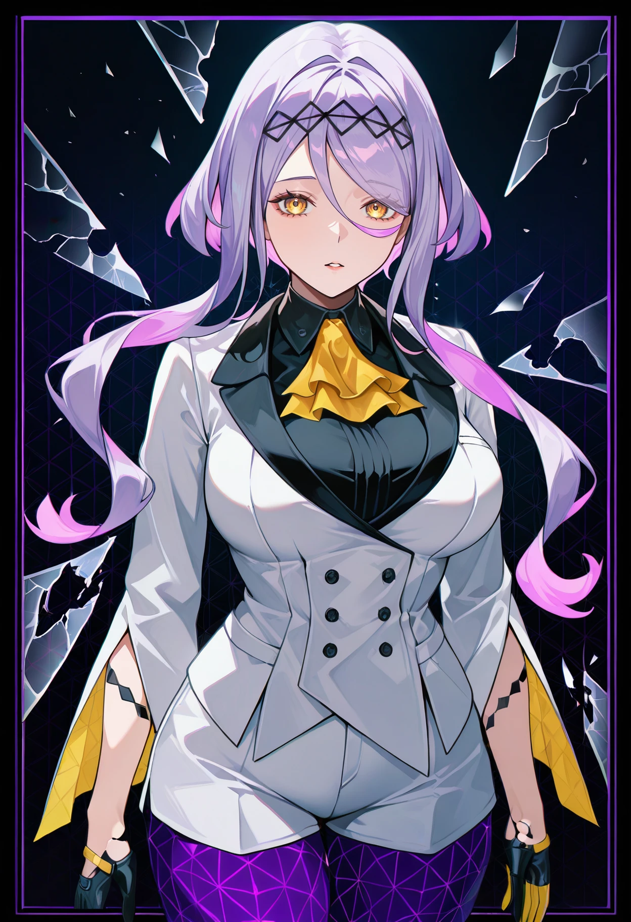 figue, yellow eyes, purple hair, multicolored hair, hairband, hair between eyes, sidelocks, yellow ascot, white coat, long sleeves, black shirt, half gloves, black gloves, white shorts, purple leggings, large breasts