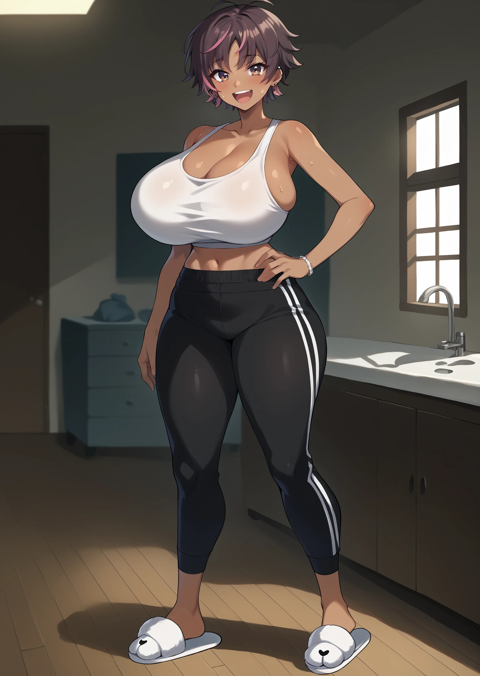 Bon, dark-skinned female, huge breasts, brown hair, colored tips, pink hair, short hair, earrings, ear piercing, jewelry, multicolored hair,
