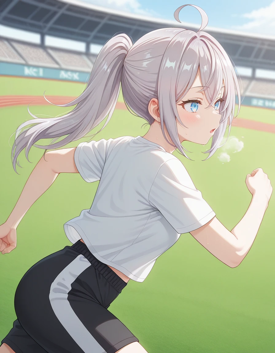 <lora:alisa_mikhailovna_kujou-roshidere_s1-ixl-anime-soralz:1>, alisa mikhailovna kujou (roshidere), long hair, silver hair, ahoge, crossed bangs, ponytail, sidelocks, blue eyesCharacter - Ponytail (PDXL-v2.0)