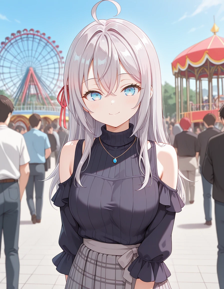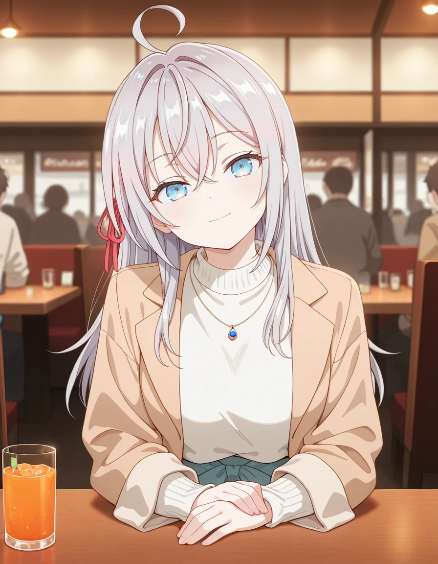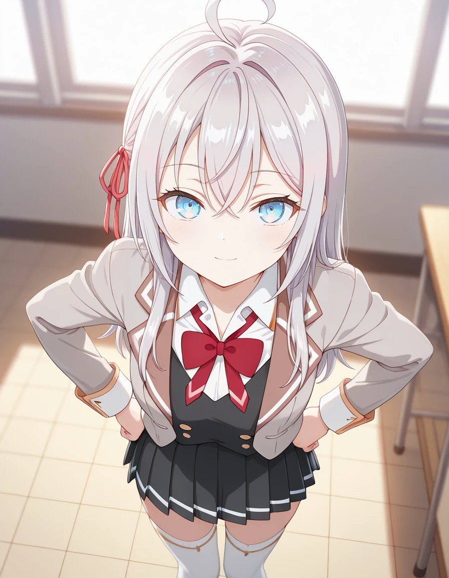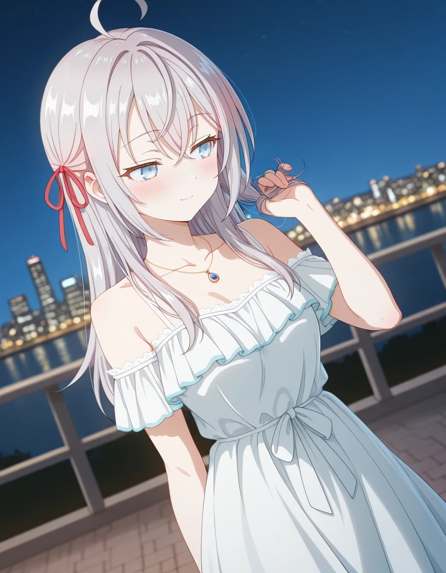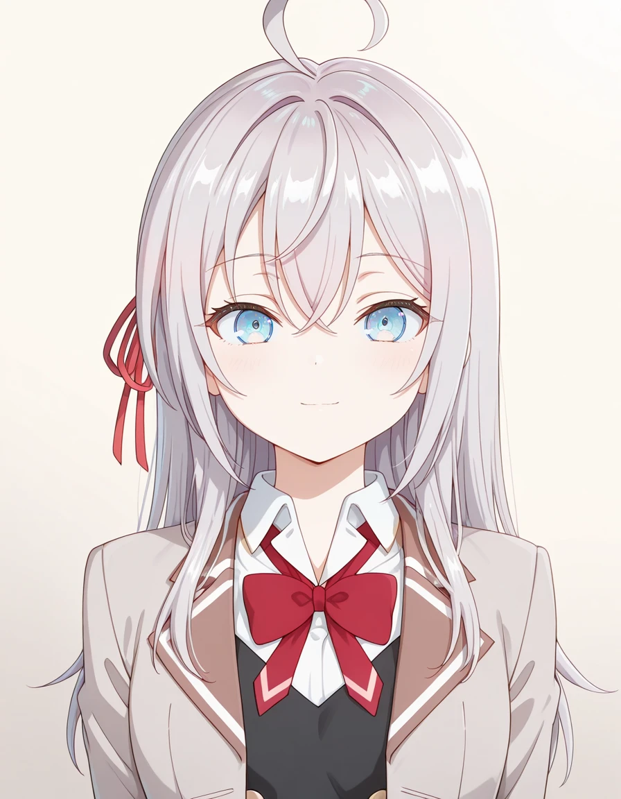 <lora:alisa_mikhailovna_kujou-roshidere_s1-ixl-anime-soralz:1>, alisa mikhailovna kujou (roshidere), long hair, silver hair, ahoge, crossed bangs, red hair ribbon, sidelocks, blue eyes