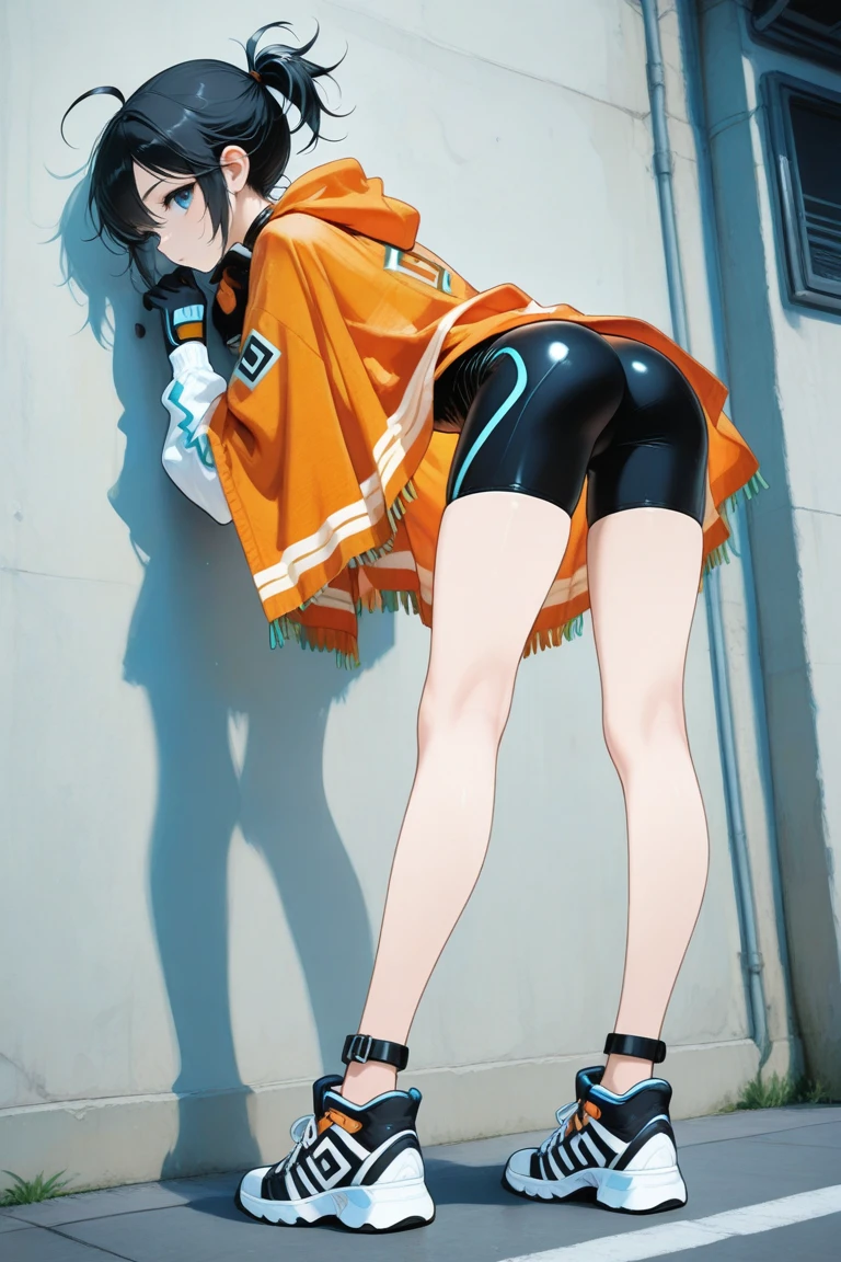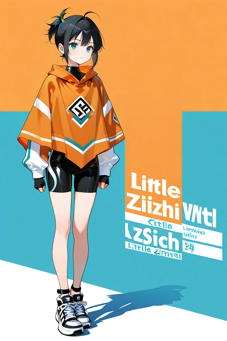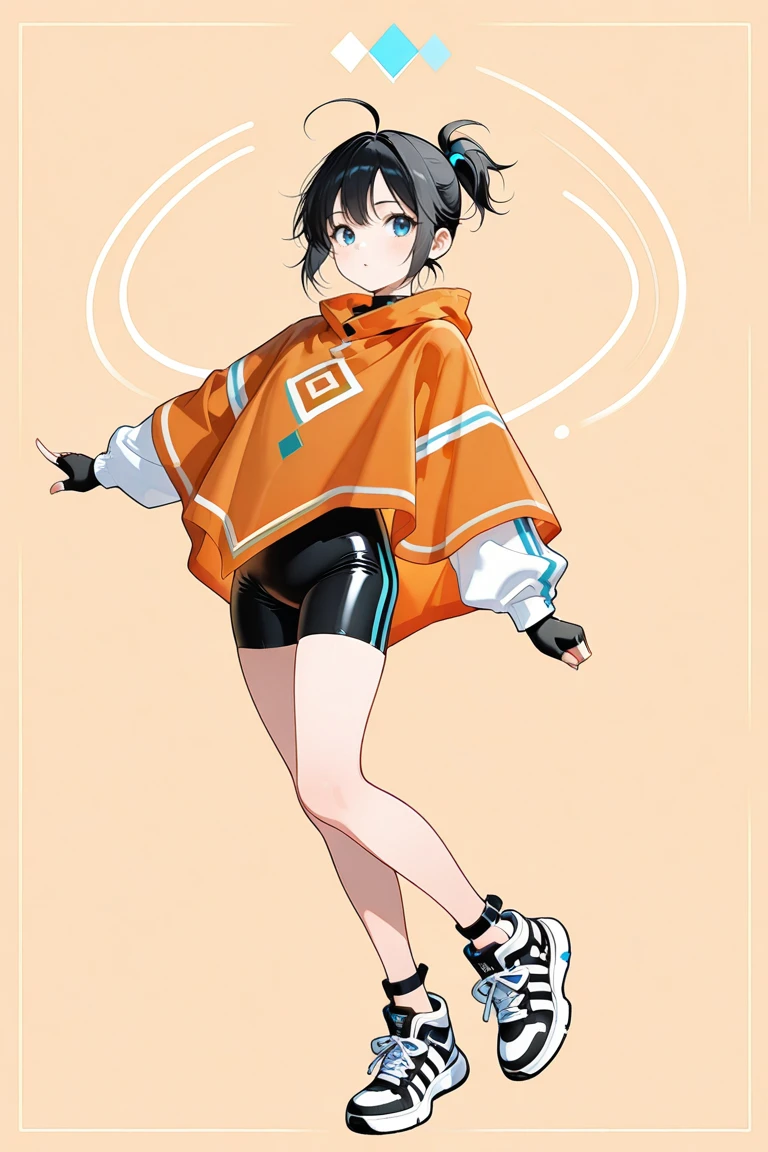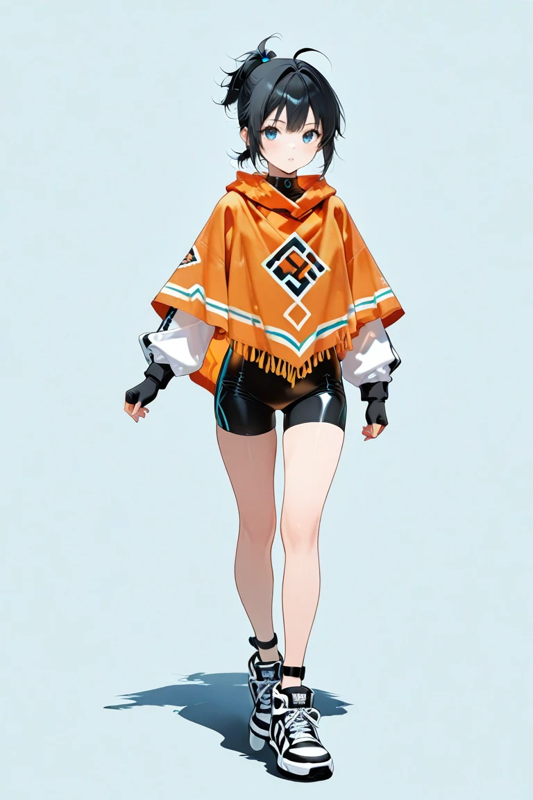 little_ziyi,black hair,short ponytail,blue eyes,fingerless gloves,orange poncho,black bodysuit ,white striped long sleeves, black bike shorts,ankle strap,striped sneakers,