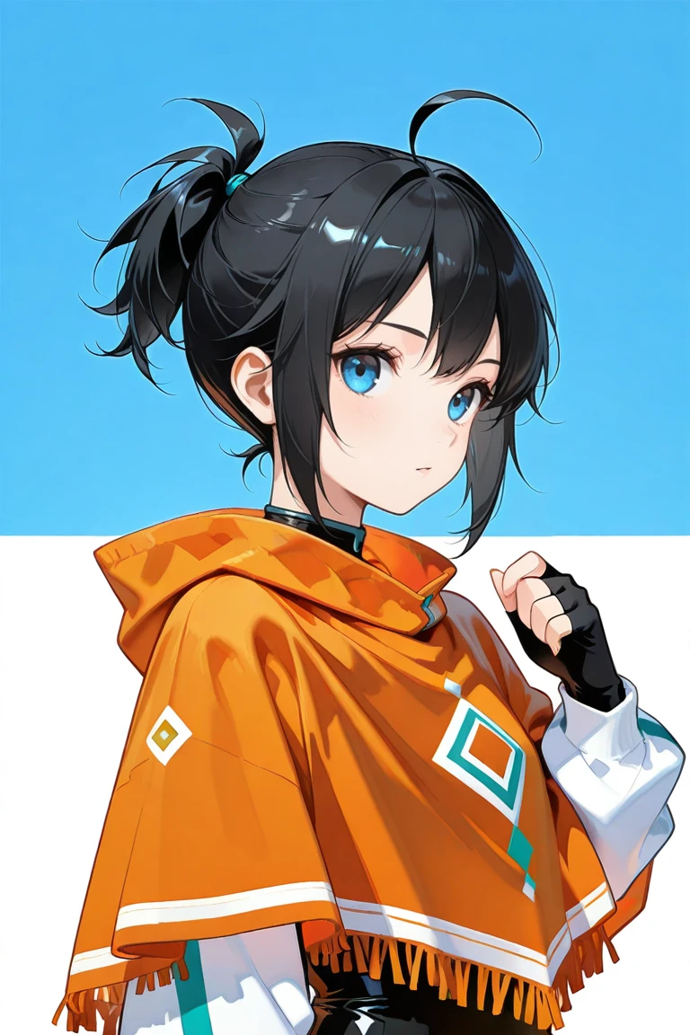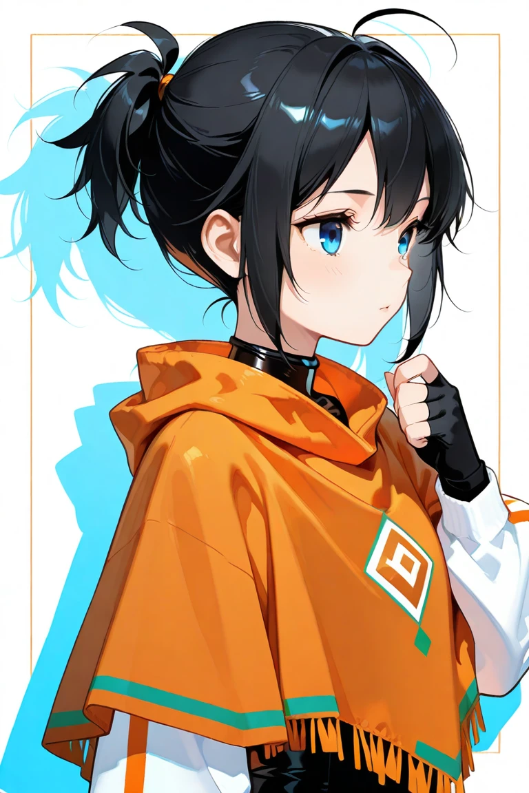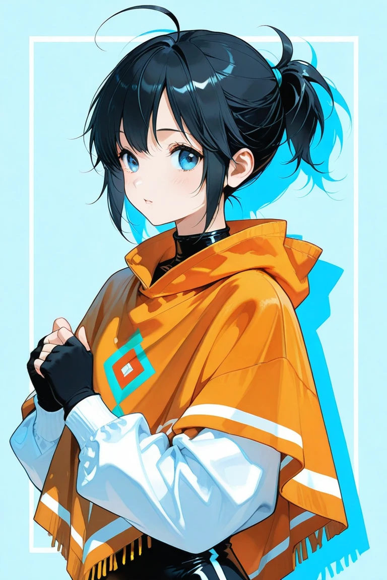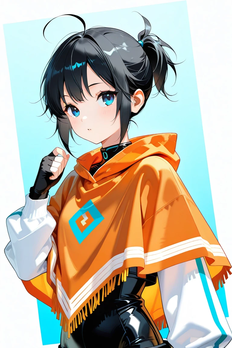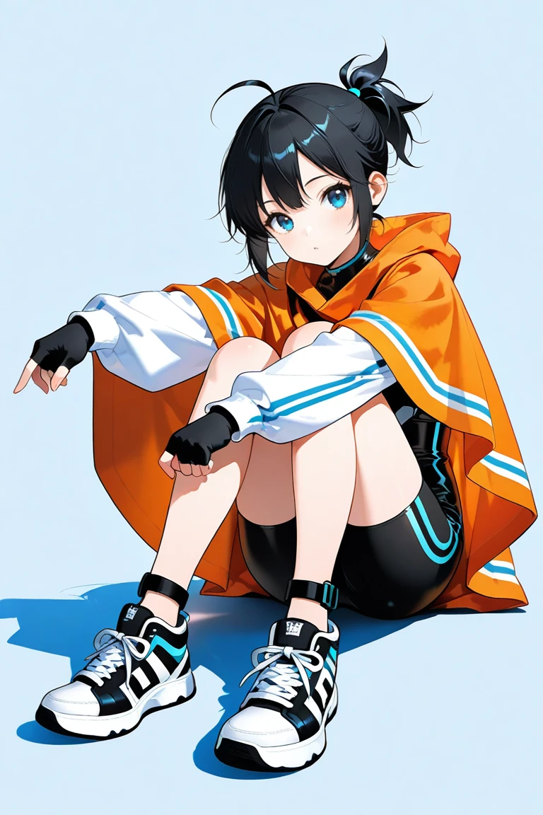 little_ziyi,black hair,short ponytail,blue eyes,fingerless gloves,orange poncho,black bodysuit ,white striped long sleeves, black bike shorts,ankle strap,striped sneakers,