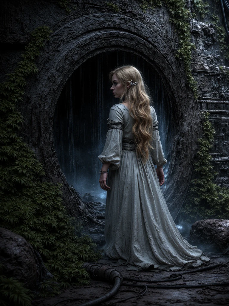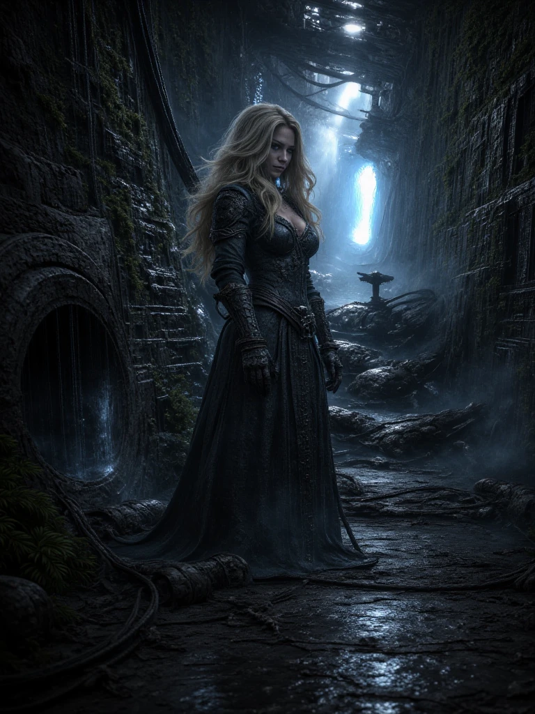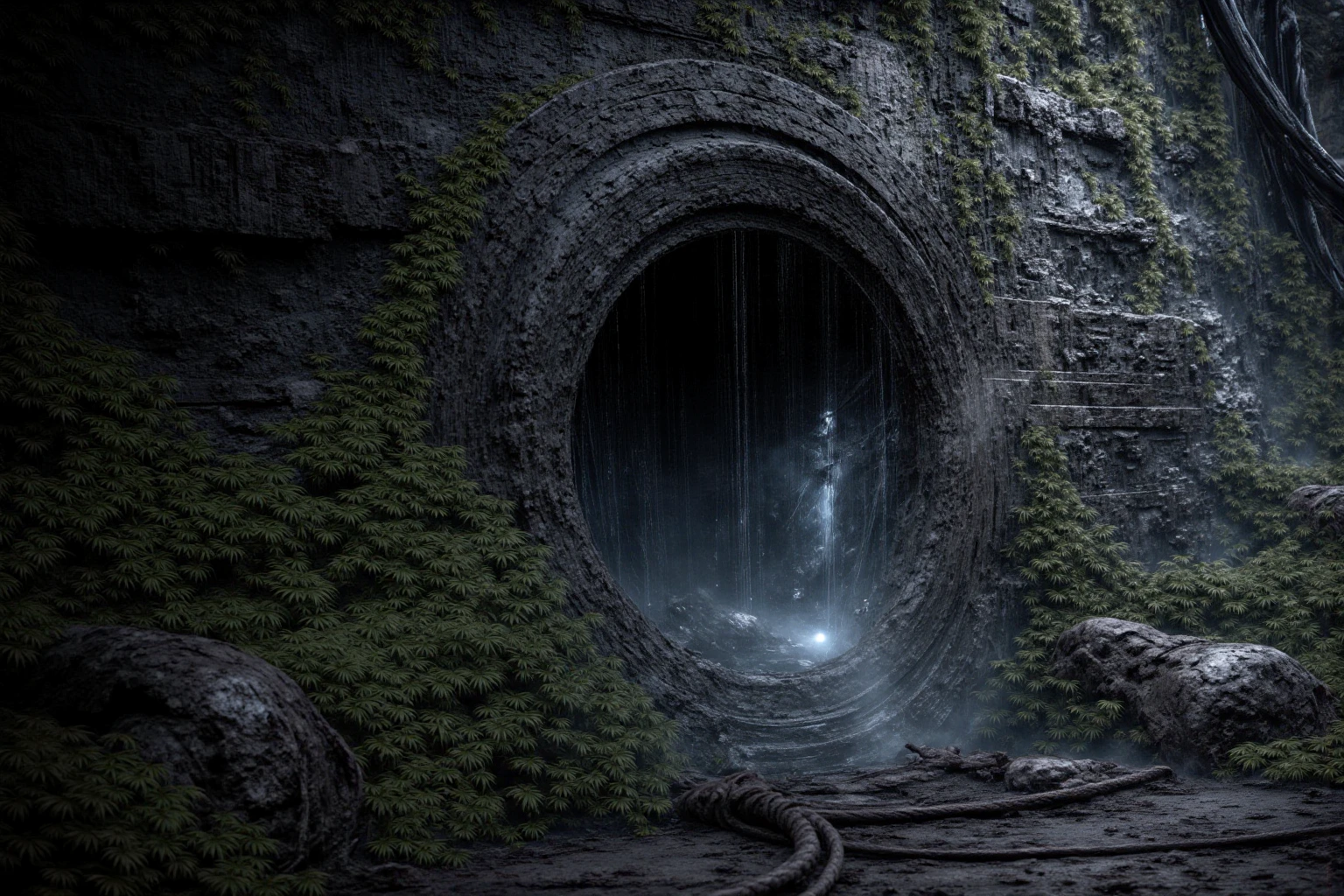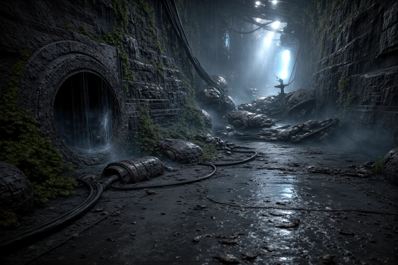 Forgotten Underground Passage, abandoned subterranean corridor inside ancient industrial ruins, damp stone walls covered with moss, vines and mineral stains, decayed pipes and cables running along both sides, on the left a human-height dark tunnel entrance recessed into the wall, arched opening leading into deeper darkness, narrow passage framed by rough aged masonry, high above the corridor rusted metal trusses and broken structural beams where the ceiling has collapsed, sunlight filtering down through the gaps creating soft volumetric light beams in the humid air, long atmospheric shadows, dim cold ambient light mixed with warm sunlight shafts, wet uneven stone floor covered with shallow water puddles, mud, debris and scattered fragments, reflective damp surfaces, abandoned forgotten atmosphere, cinematic perspective, detailed environment, realistic scale, mysterious ancient underground world.