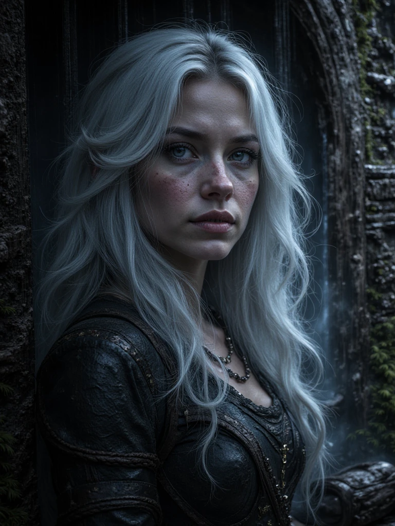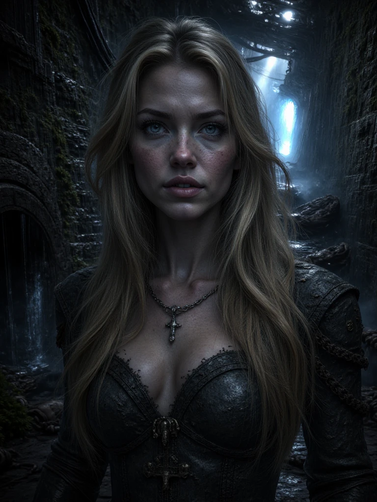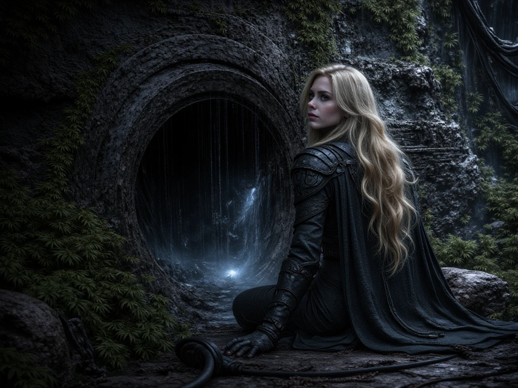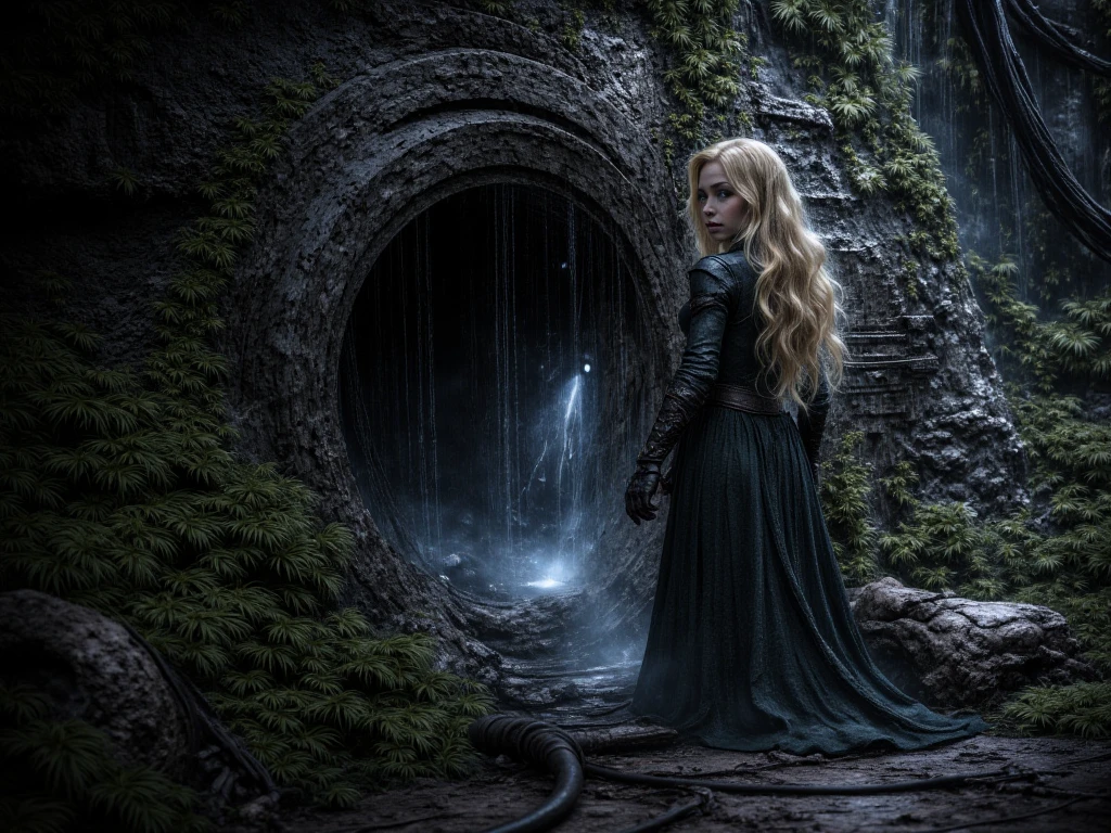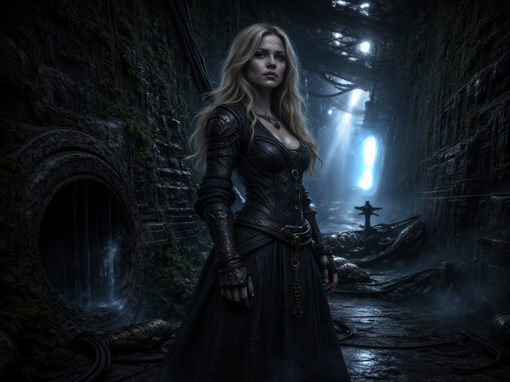 Forgotten Underground Passage, abandoned subterranean corridor inside ancient industrial ruins, damp stone walls covered with moss, vines and mineral stains, decayed pipes and cables running along both sides, on the left a human-height dark tunnel entrance recessed into the wall, arched opening leading into deeper darkness, narrow passage framed by rough aged masonry, high above the corridor rusted metal trusses and broken structural beams where the ceiling has collapsed, sunlight filtering down through the gaps creating soft volumetric light beams in the humid air, long atmospheric shadows, dim cold ambient light mixed with warm sunlight shafts, wet uneven stone floor covered with shallow water puddles, mud, debris and scattered fragments, reflective damp surfaces, abandoned forgotten atmosphere, cinematic perspective, detailed environment, realistic scale, mysterious ancient underground world.