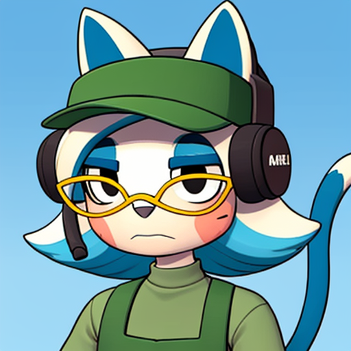 Furry, Cat Girl, Karen, white fur, white hair, blue hair, tail, green sweater, apron, yellow glasses, headphones, ribbon,
