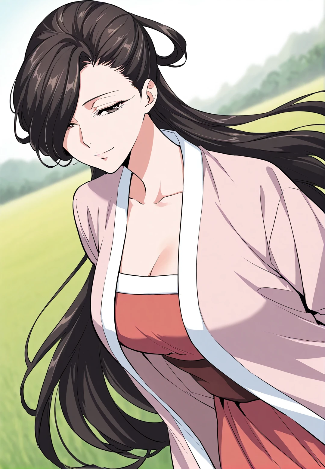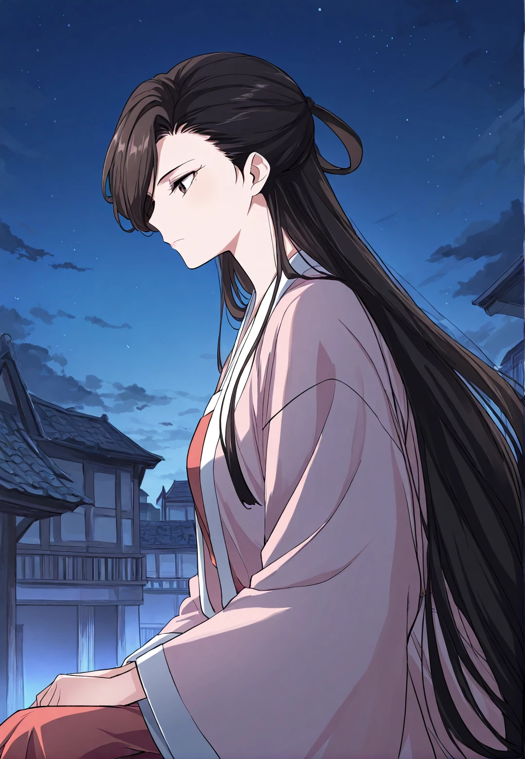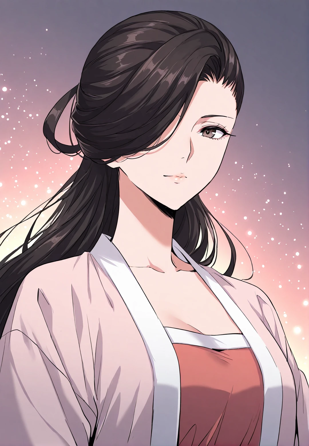1 girl, solo, very long black hair, side-swept bangs, curled side strand, single eye covered, hair behind ear, thick front lock, dark brown eyes,