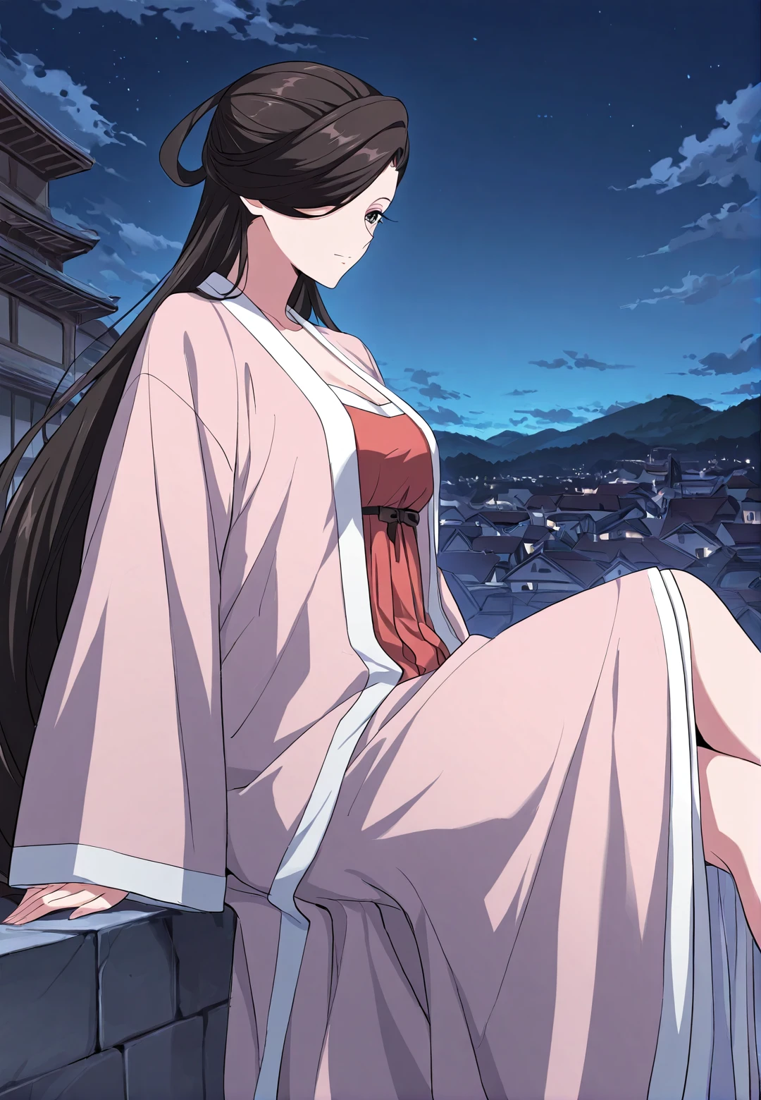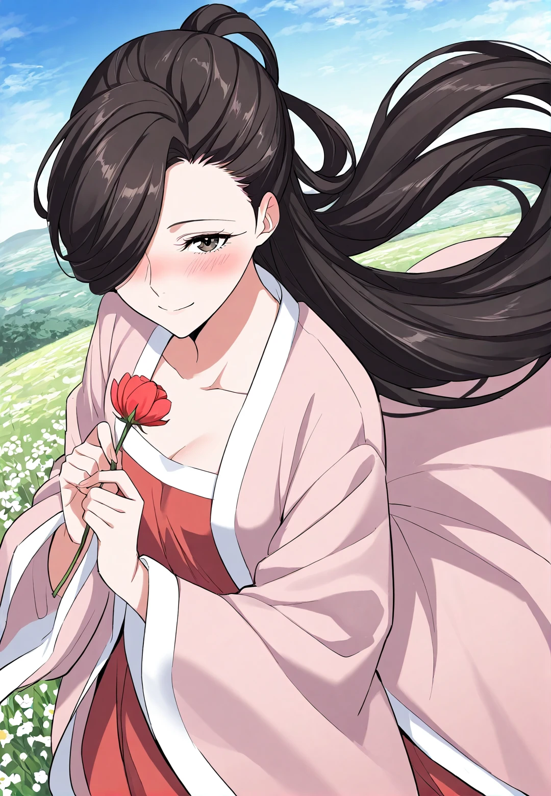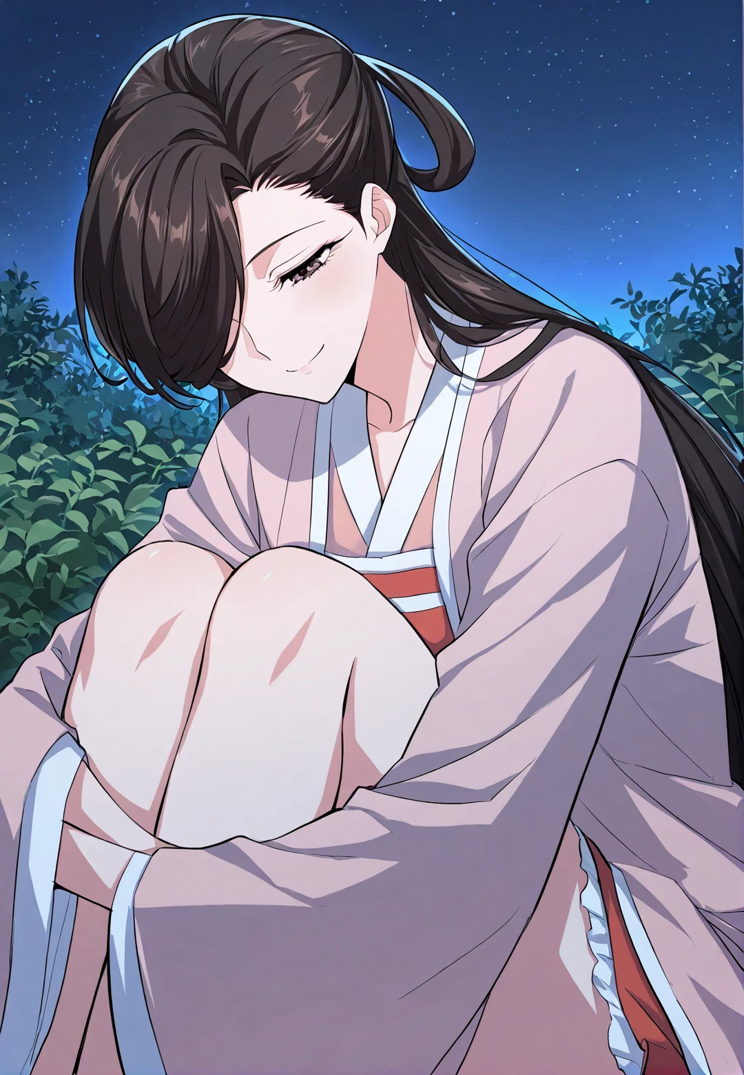 1 girl, solo, very long black hair, side-swept bangs, curled side strand, single eye covered, hair behind ear, thick front lock, dark brown eyes,
