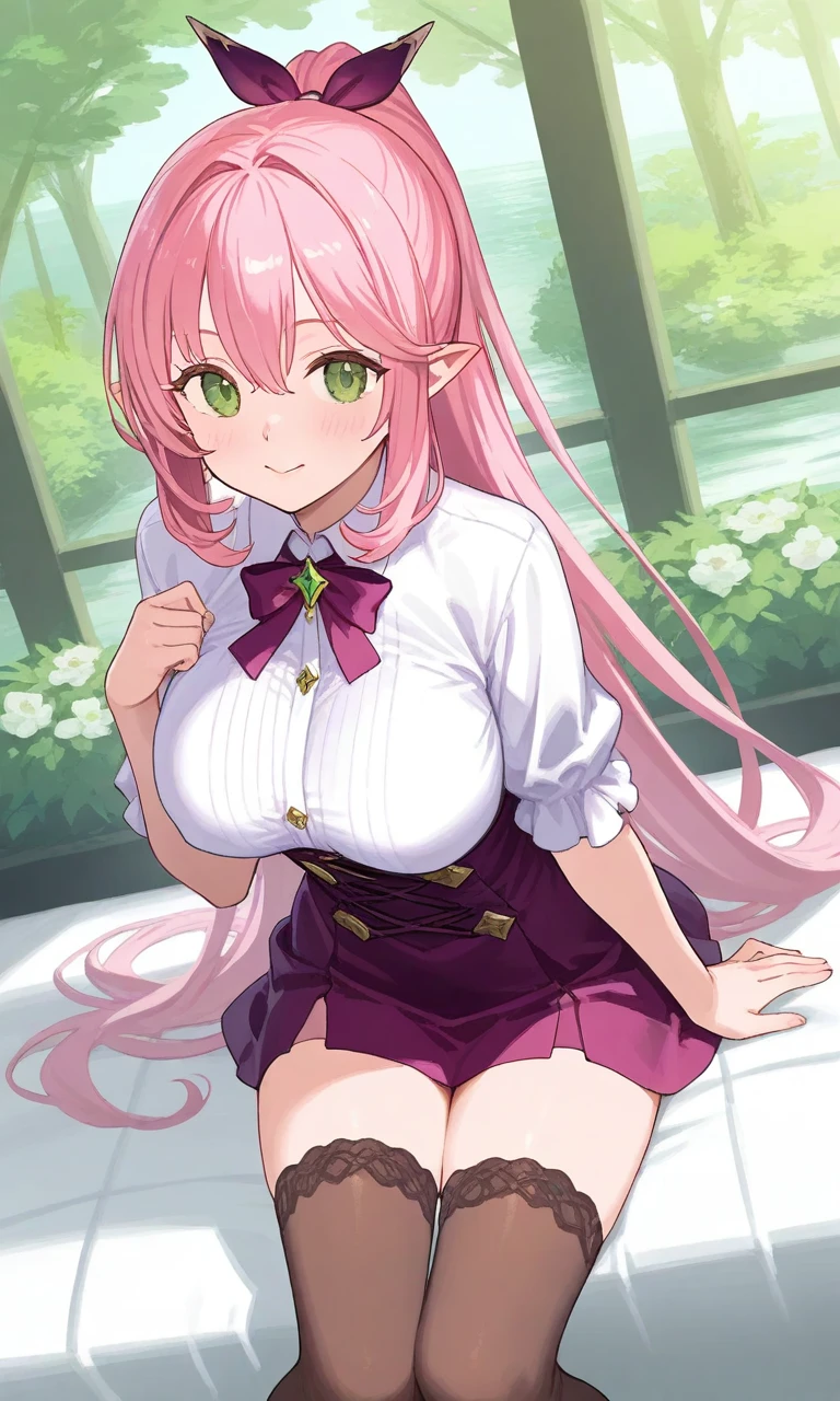 • Alira_(evertale), green eyes, pink hair, long hair, pointy ears, ponytail <alternate costume>, school uniform, white shirt, pleated skirt, buttoned gap, breasts, pink bow necker, collared shirt open, choker with flower design, hair bow pink, shiny pink heart earrings, open pink cardigan clothes, shirt tuck in, single off shoulder, pink with flower thigh strap, shoes, knee white socks