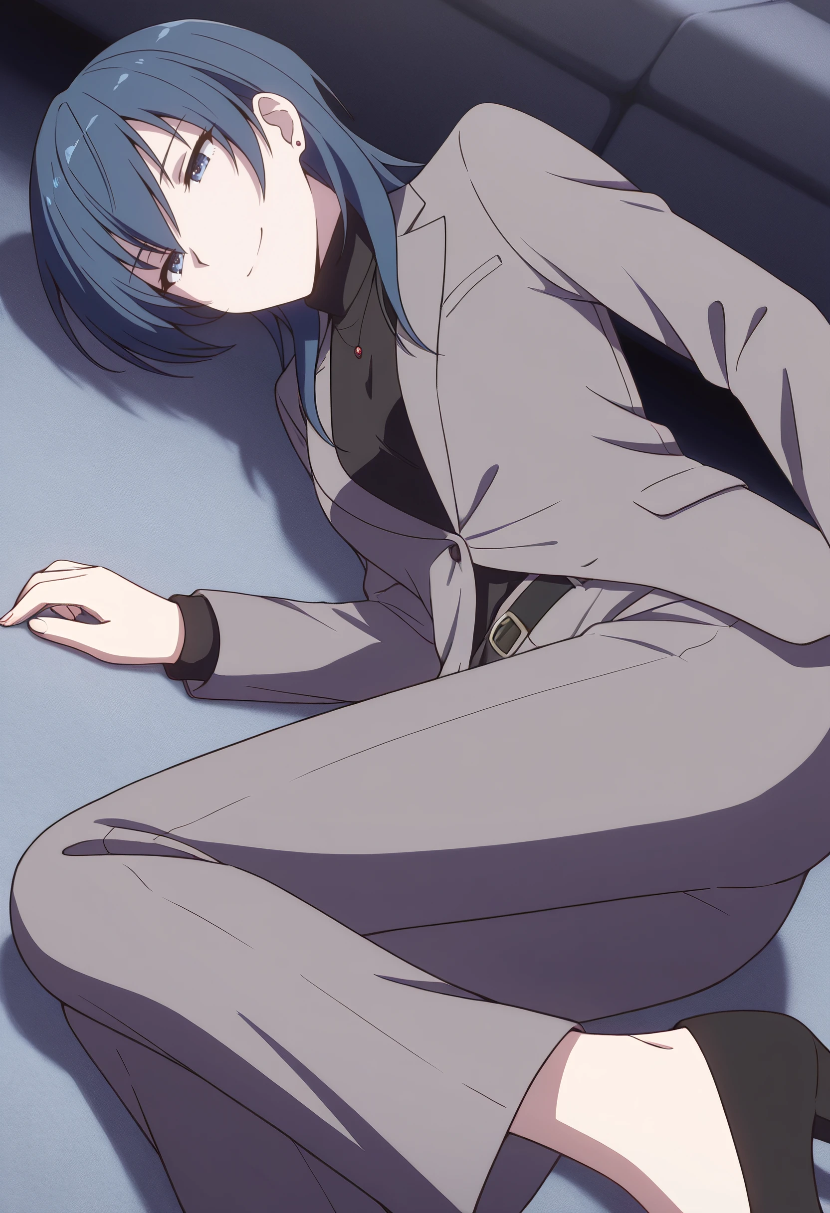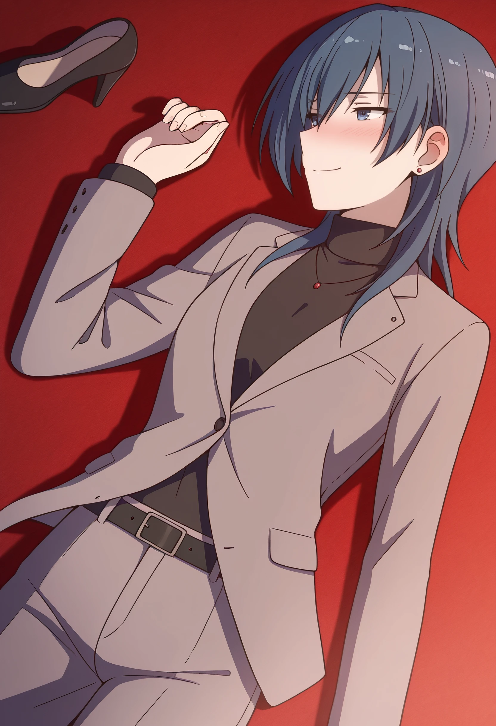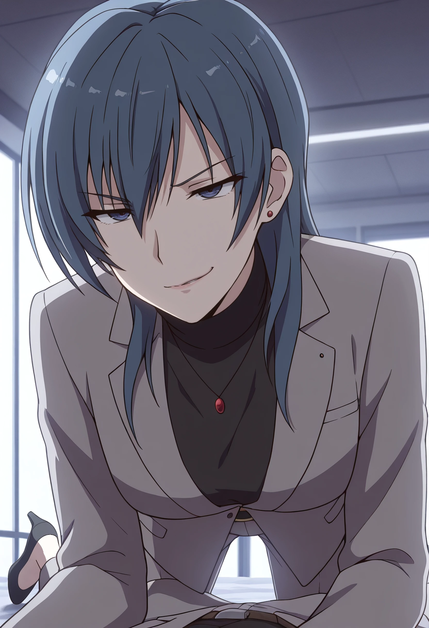 YuzukiSuit, jacket, turtleneck, long hair, jewelry, sweater, necklace, hair between eyes, turtleneck sweater, long sleeves, blazer, suit, formal clothes, black sweater, shirt, black shirt, pants, earrings, grey jacket, grey pants, stud earrings, pant suit, belt, grey suit, black footwear, shoes, business suit, grey coat, high heels, black belt,