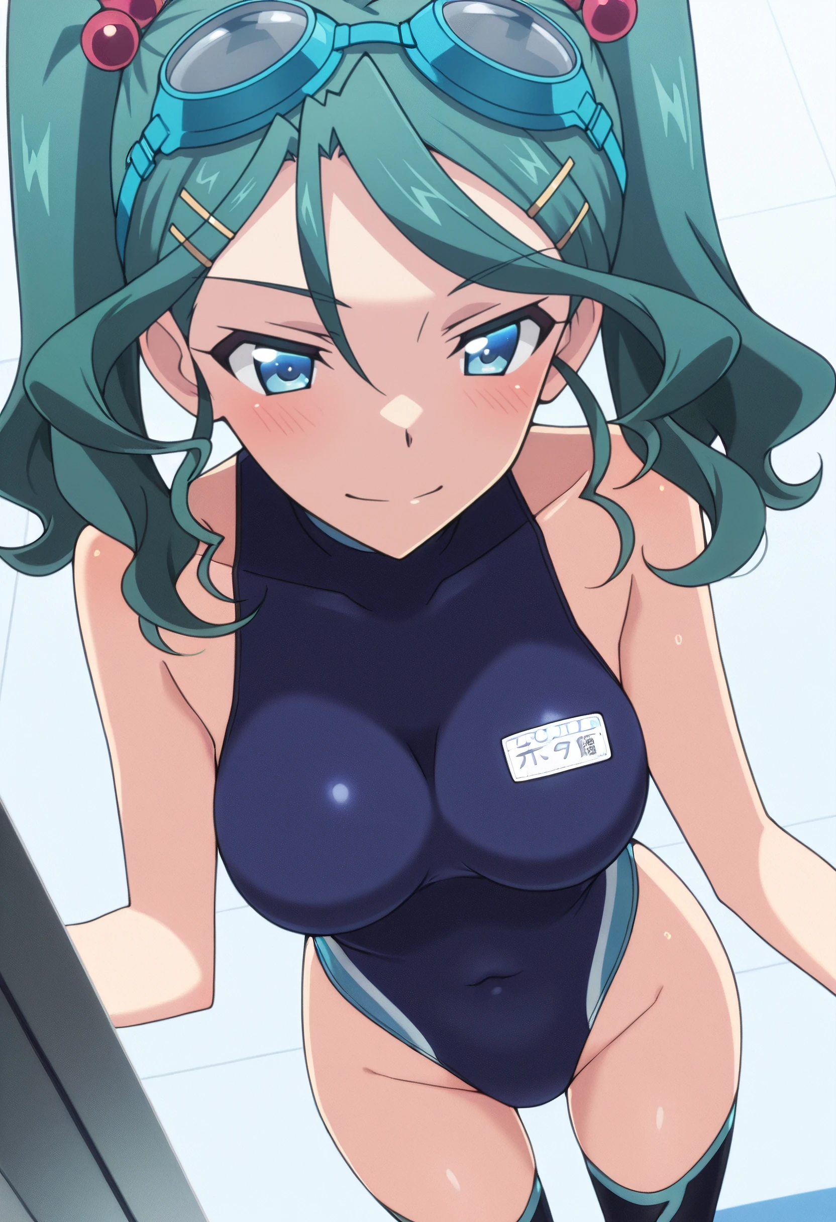 HikarunoBodysuit, goggles, one-piece swimsuit, swimsuit, blue one-piece swimsuit, goggles on head, thighhighs, competition swimsuit, name tag, black thighhighs, covered navel, highleg one-piece swimsuit, sidelocks, turtleneck, bare shoulders, skin tight,