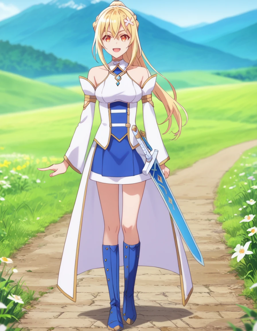 knight outfit, white dress, jewelry, off shoulder, detached sleeves, cape, sword, sheath, blue thigh bootsDescription