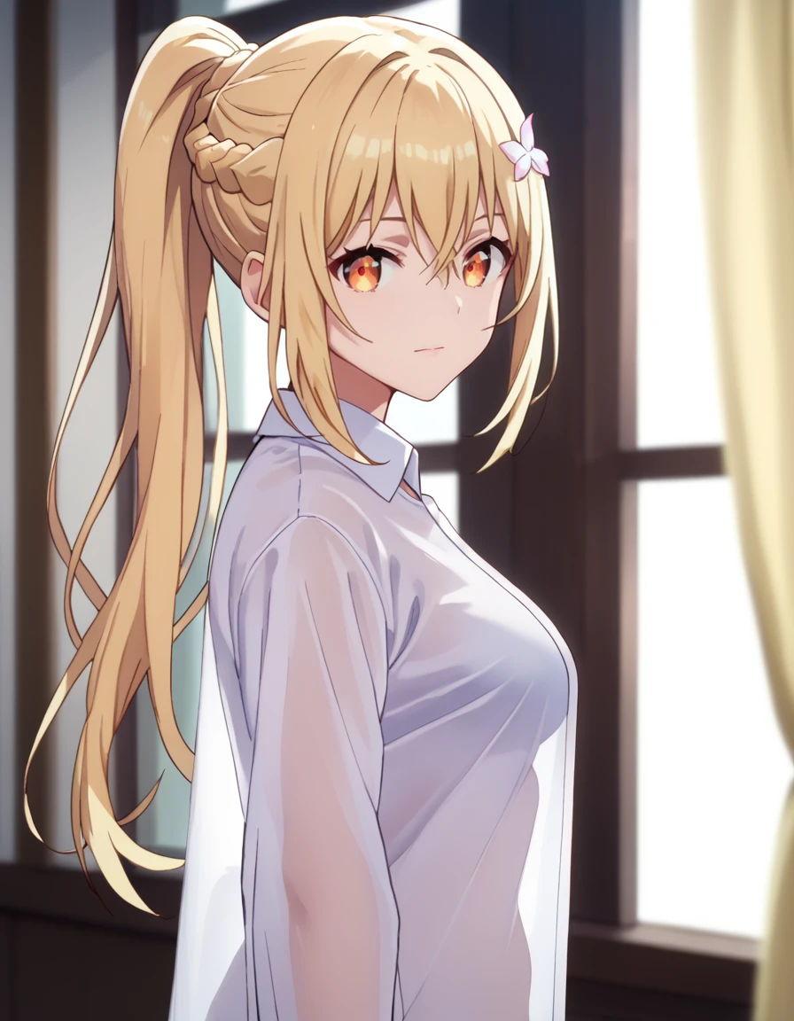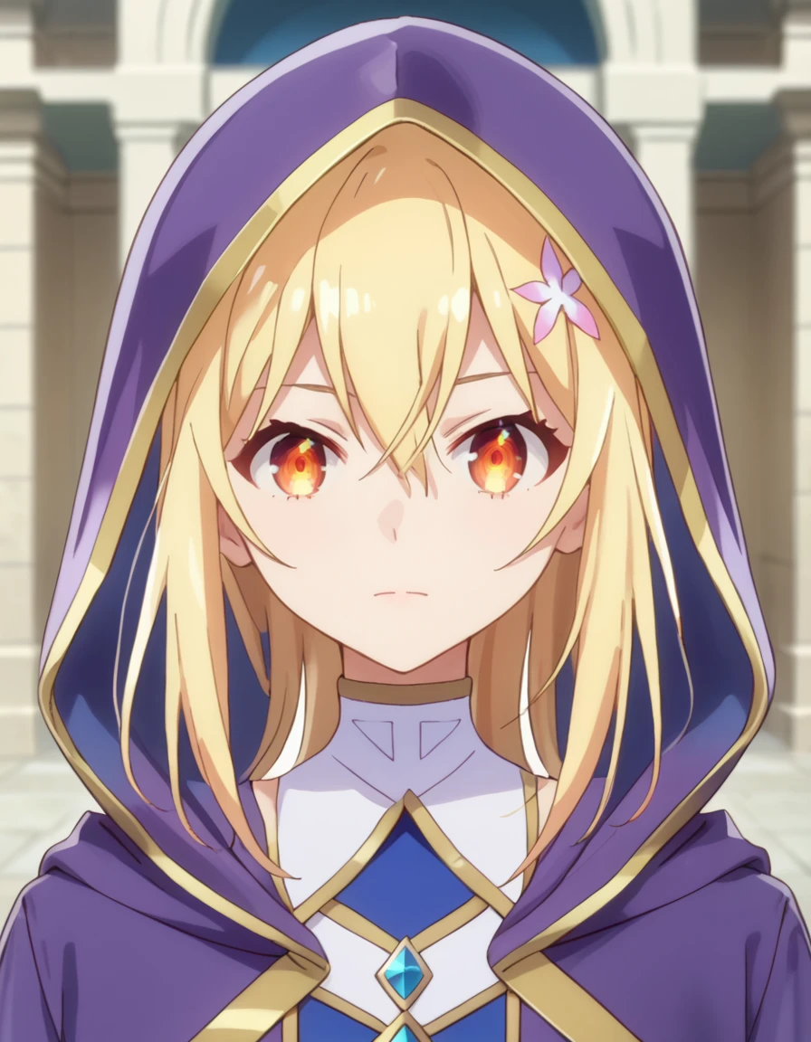 <lora:lena_floria-hazure_skill_kinomi_master_s1_v3-anime-soralz:1>, lena floria (hazure skill kinomi master), long hair, blonde hair, braid, ponytail, hair flower, sidelocks, hair between eyes, orange eyes