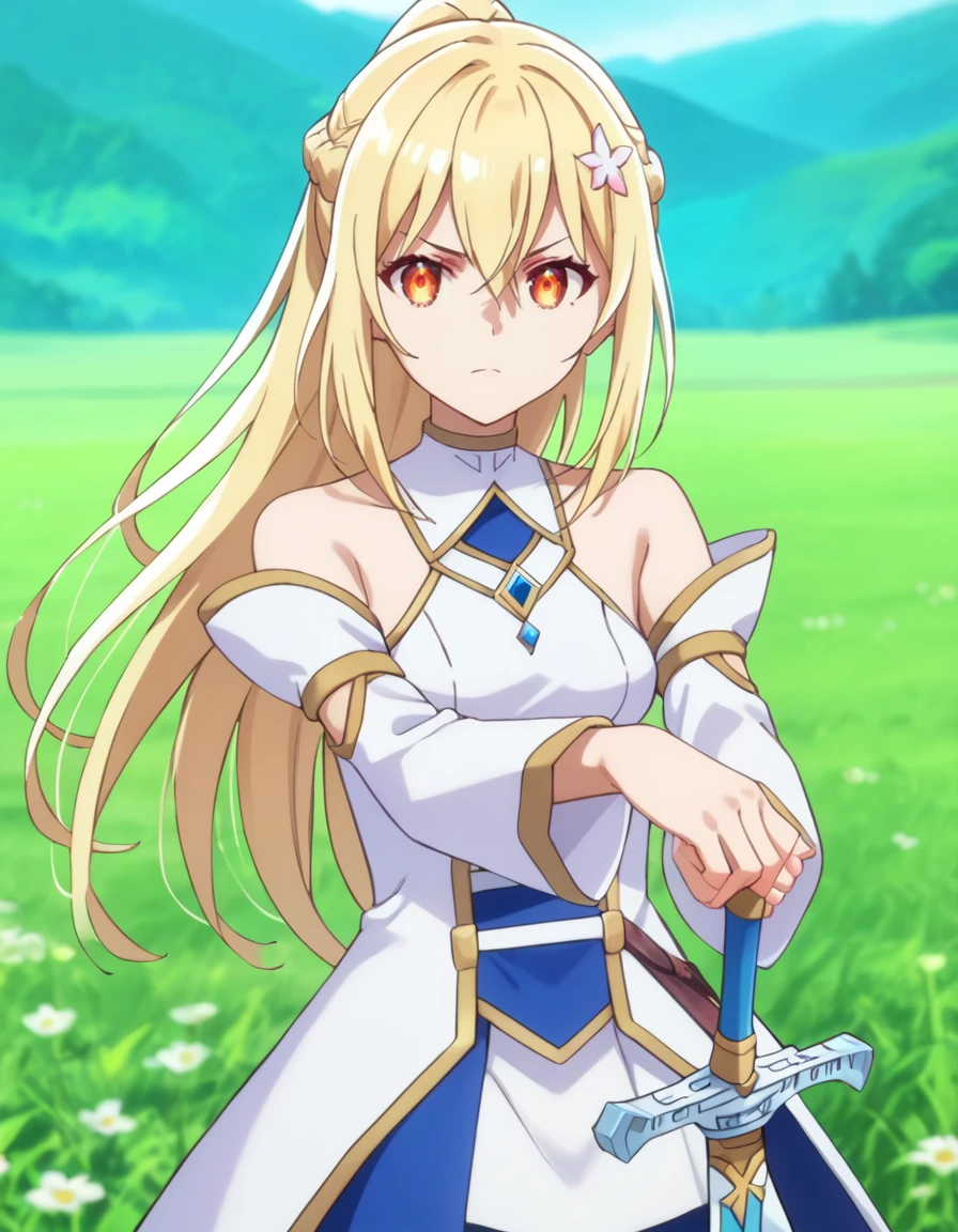 <lora:lena_floria-hazure_skill_kinomi_master_s1_v3-anime-soralz:1>, lena floria (hazure skill kinomi master), long hair, blonde hair, braid, ponytail, hair flower, sidelocks, hair between eyes, orange eyesOutfit - Default