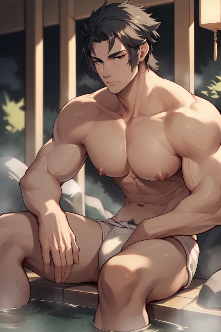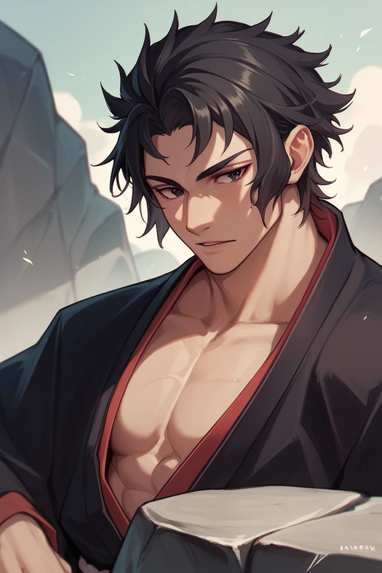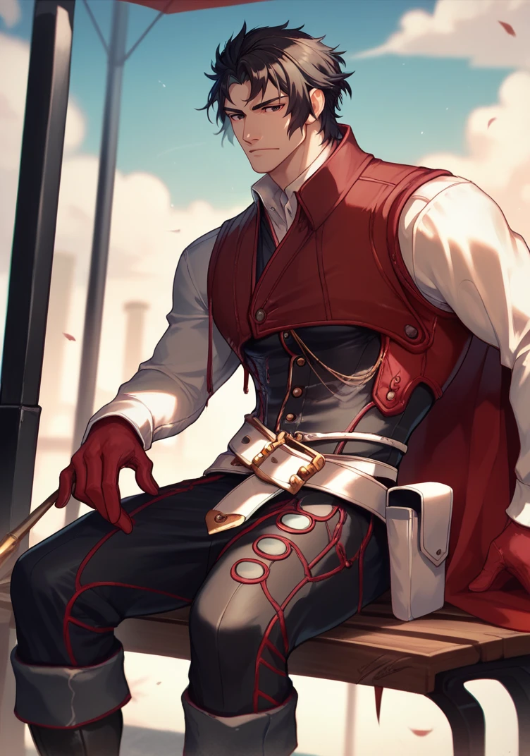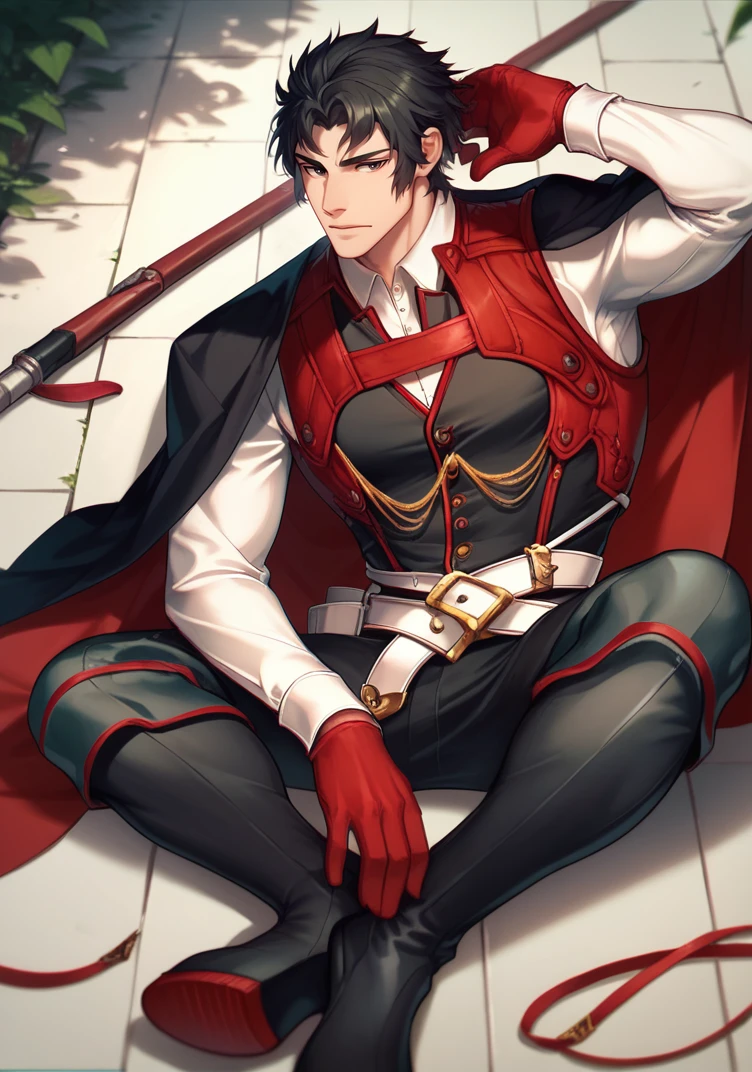black boots, cap, vest, pants, belt, uniform, red gloves, holster