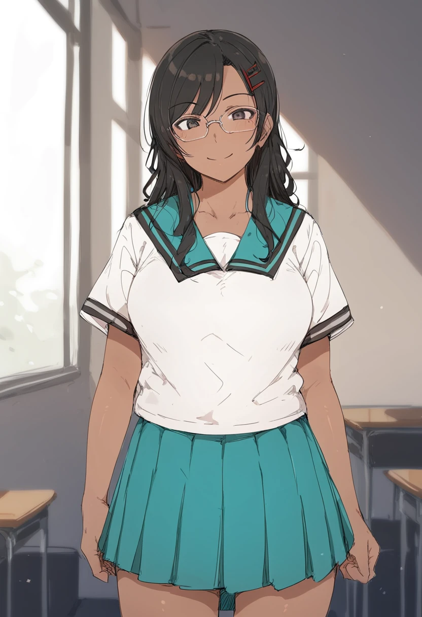 1girl,aiura_good,black hair,black hair,side swept bangs,single_sidelock,hair behind ear,long hair,red-frame glasses,dark-skinned female