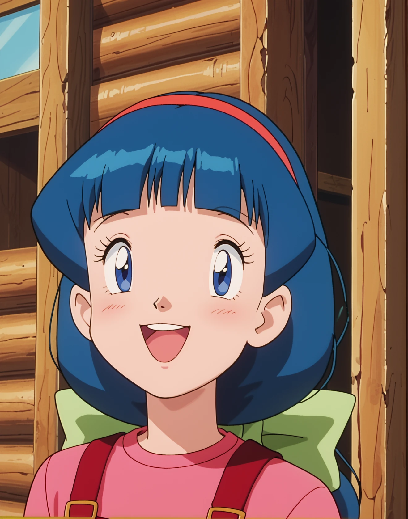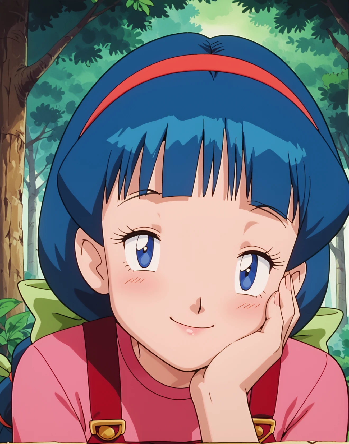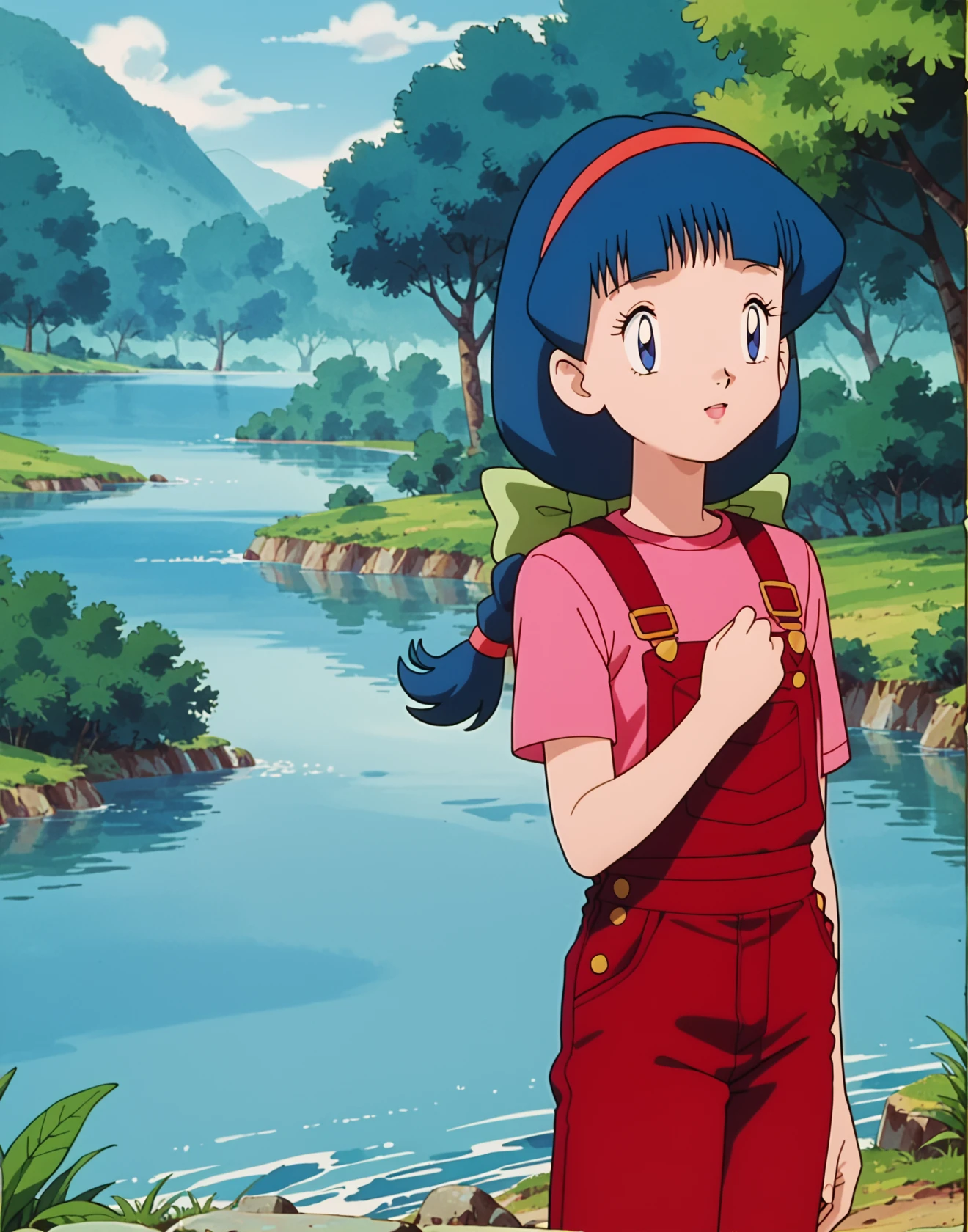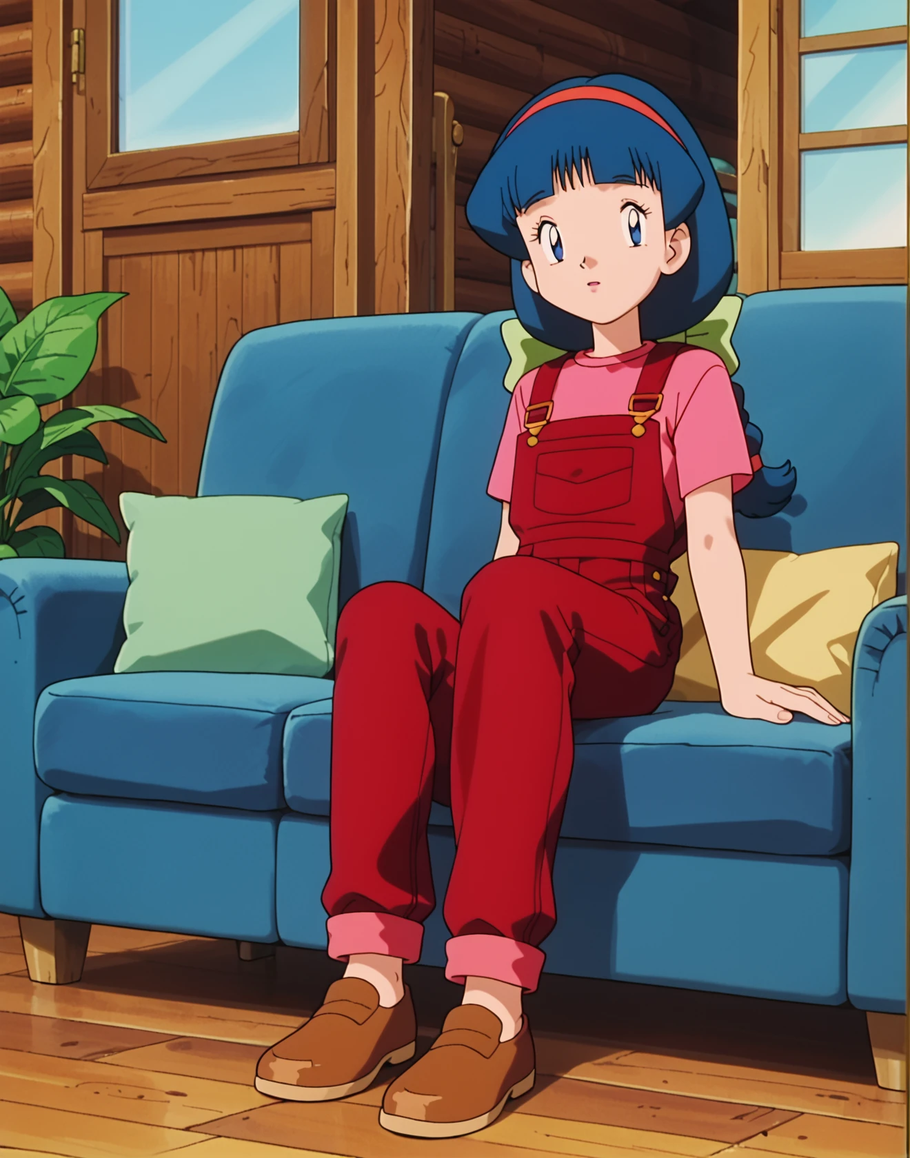 MelaPKM, blue hair, red overalls, blue eyes, pink shirt, green ribbon, single braid, long hair, retro artstyle, hairband, brown shoes,