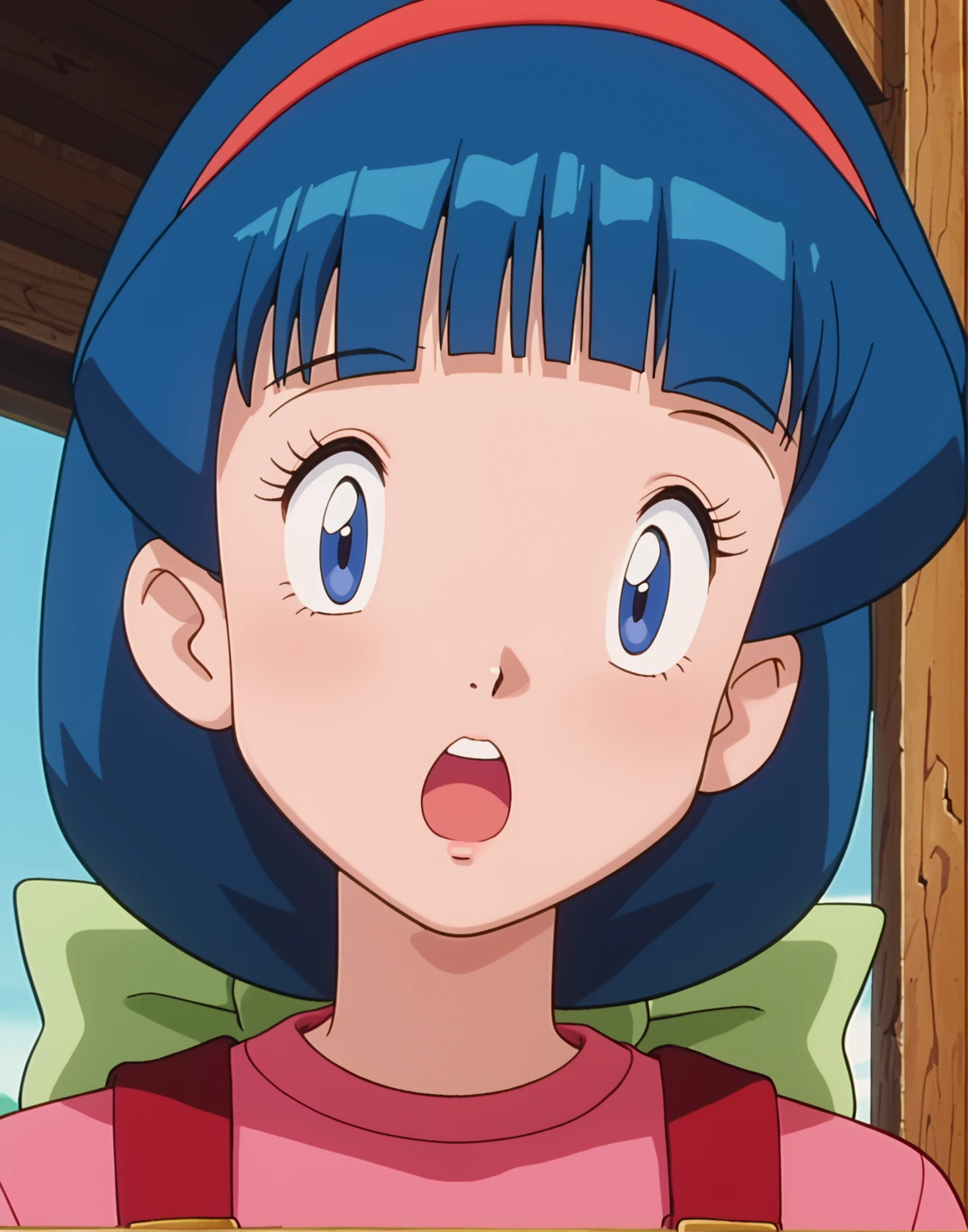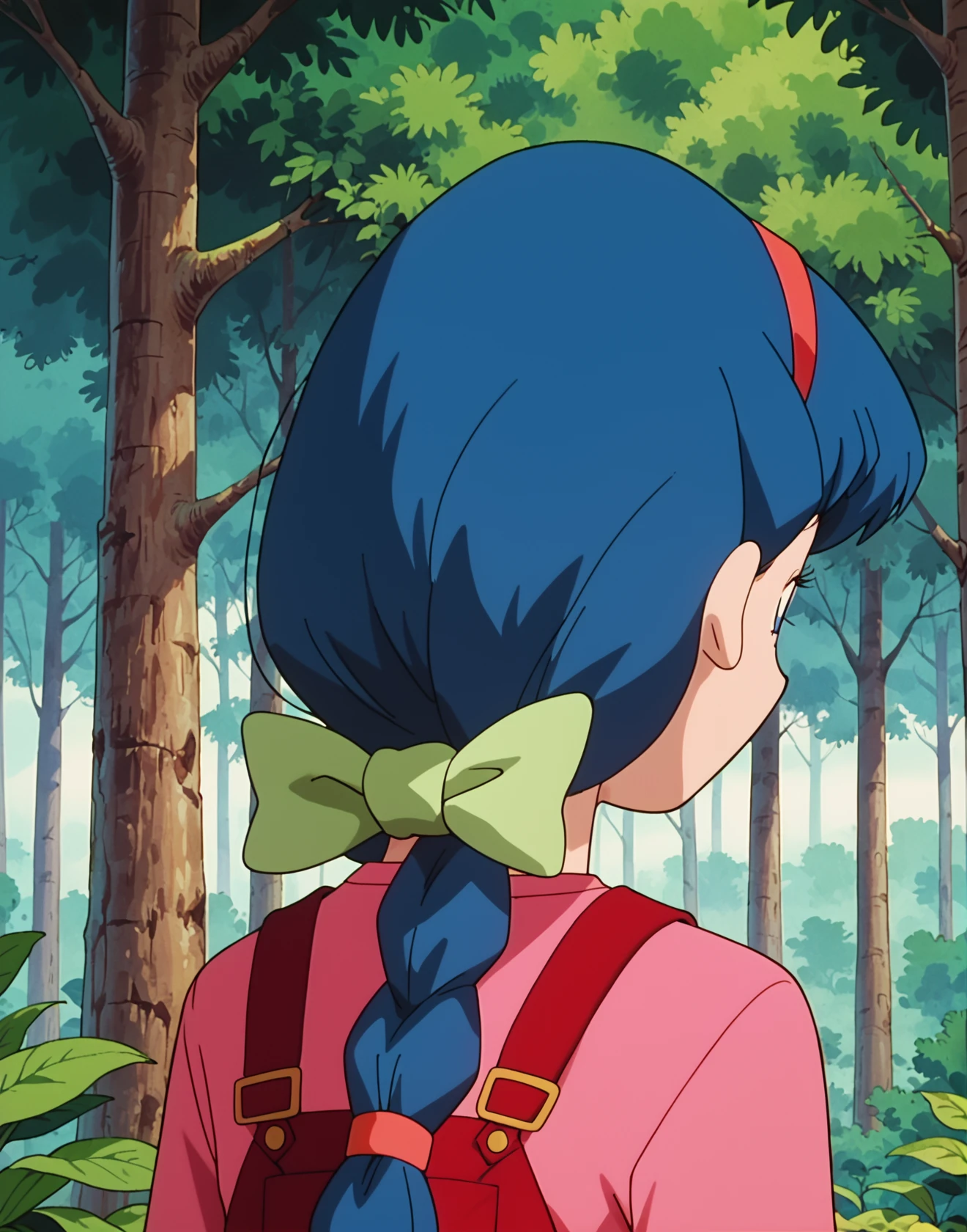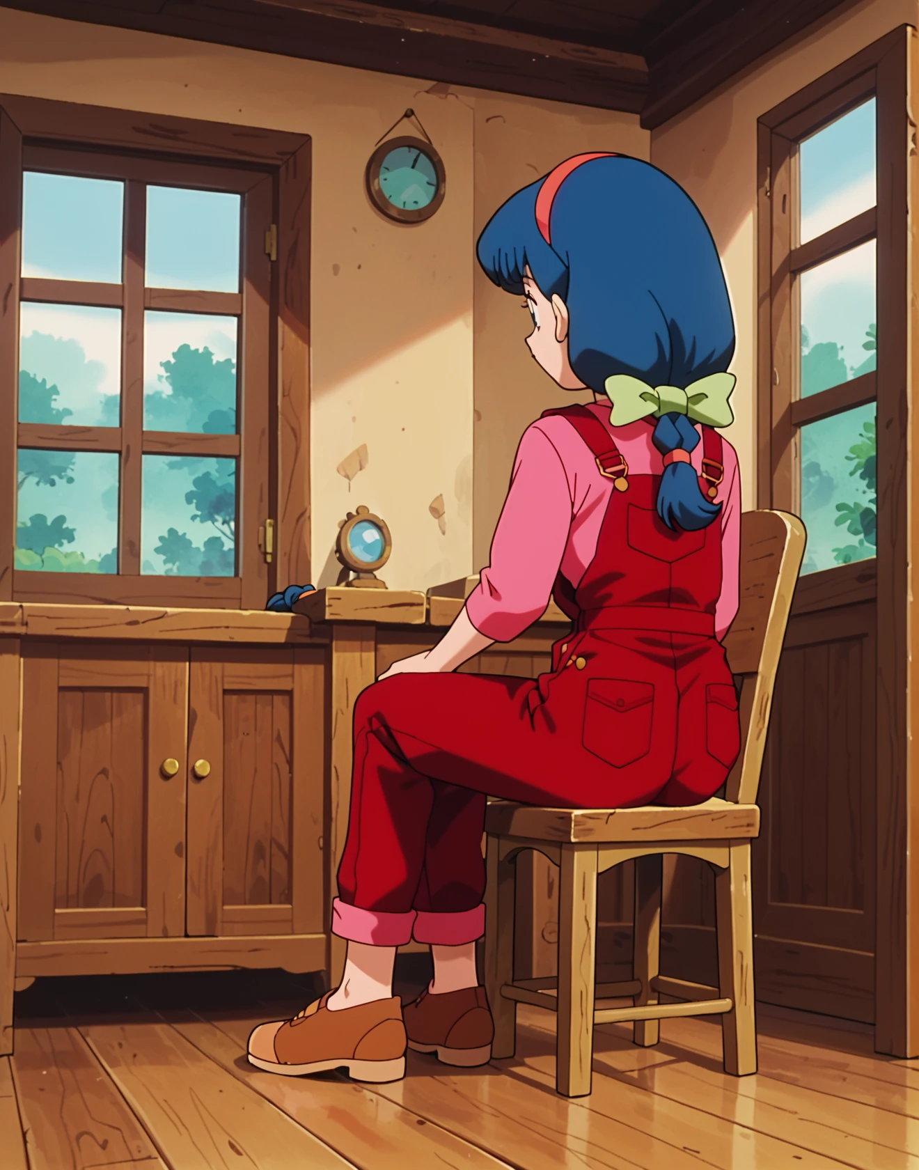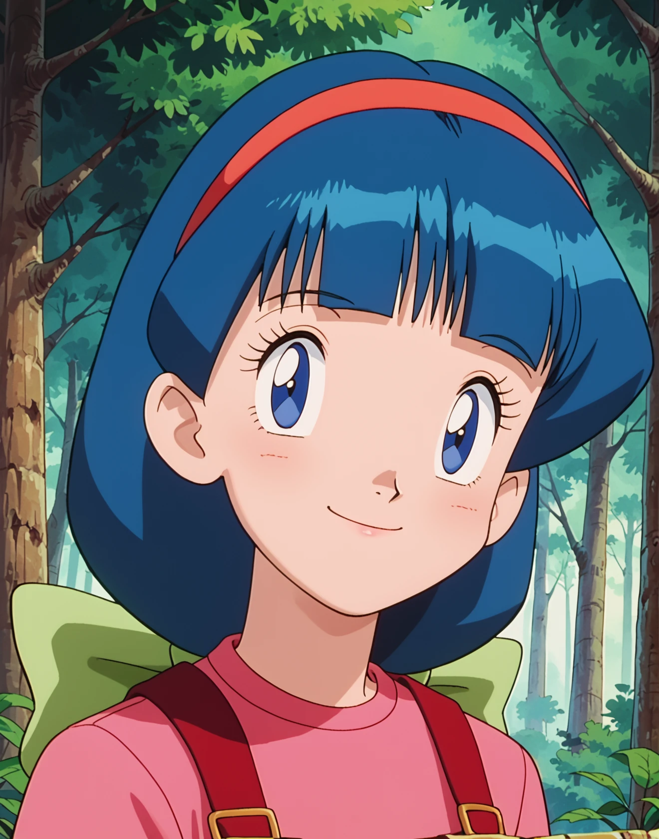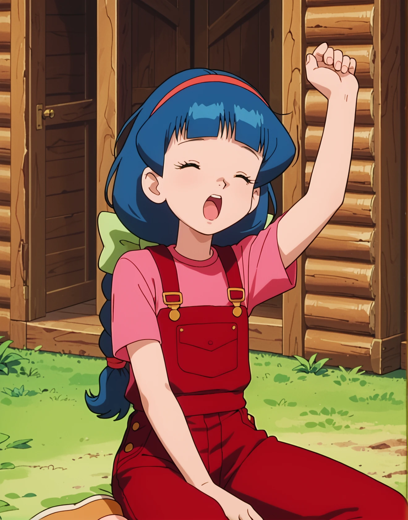 MelaPKM, blue hair, red overalls, blue eyes, pink shirt, green ribbon, single braid, long hair, retro artstyle, hairband, brown shoes,