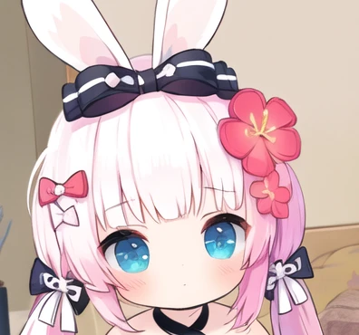 提示词:梅,hair bow,hair flower,bare shoulders,dress,very long hair,low twintails,rabbit ears