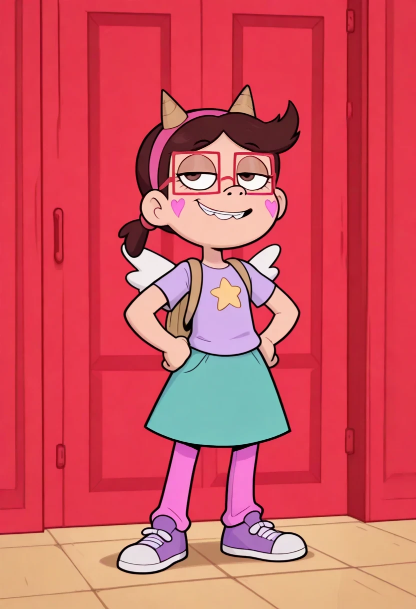 teenage girl, short brown hair tied in small ponytail with red scrunchie, bangs to left and right of forehead, brown eyes, red square-rimmed glasses, hot pink headband with pair of cardboard cones pointing upwards, pink hearts crudely painted on cheeks, short pug-like nose, braces, lavender T-shirt with yellow star design, backpack with pair of wings attached, turquoise skirt, hot pink pants, purple shoes,