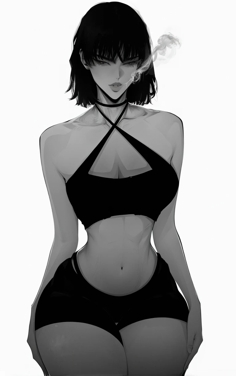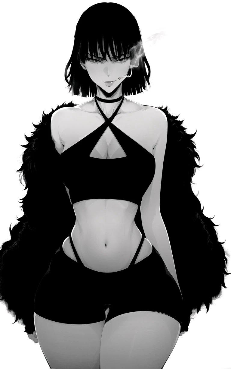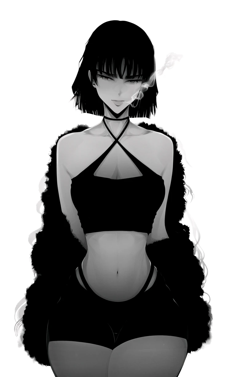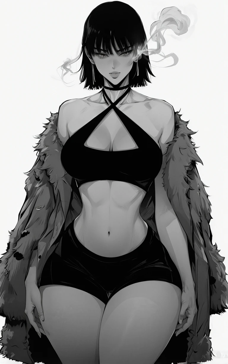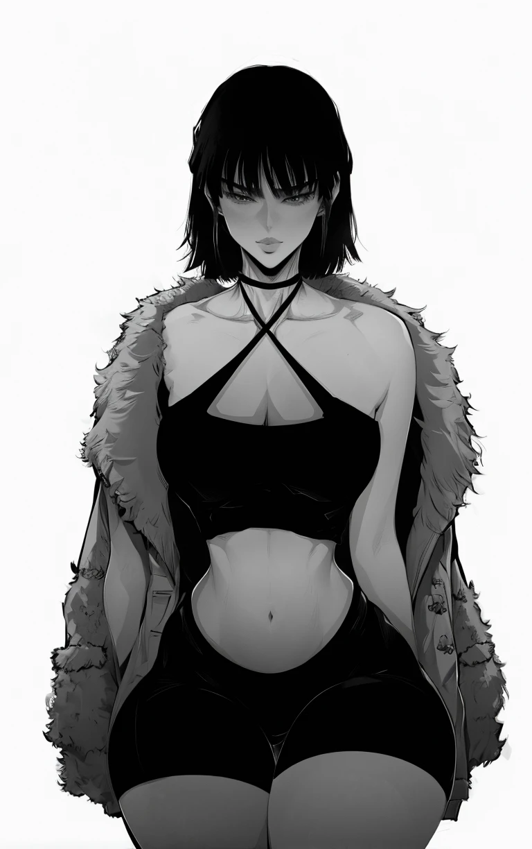 1girl, breasts, short hair, bangs, large breasts, simple background, white background, navel, cleavage, collarbone, monochrome, greyscale, thighs, midriff, halterneck, thick thighs, wide hips, criss-cross halter, fur coat, fubuki \(one-punch man\)
