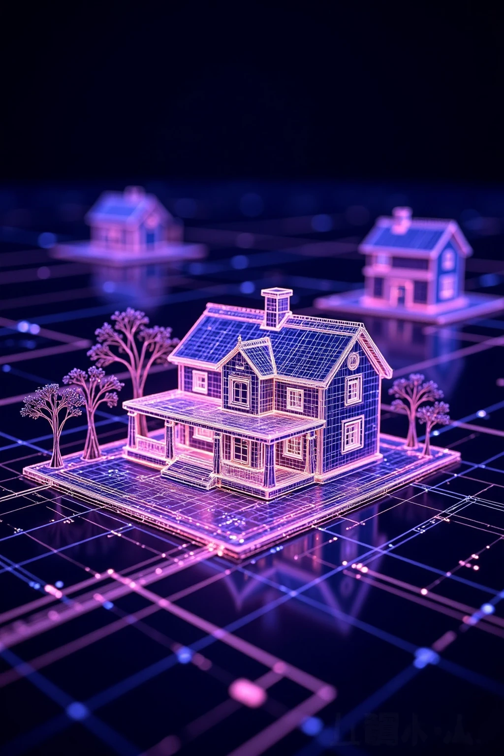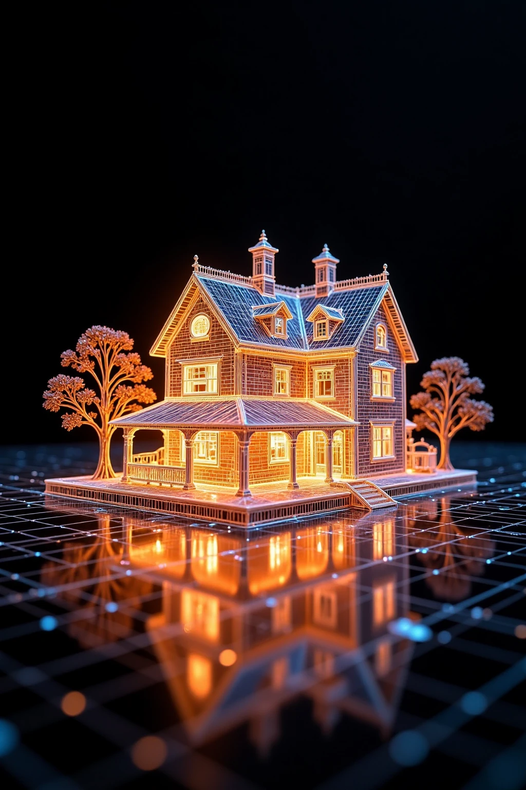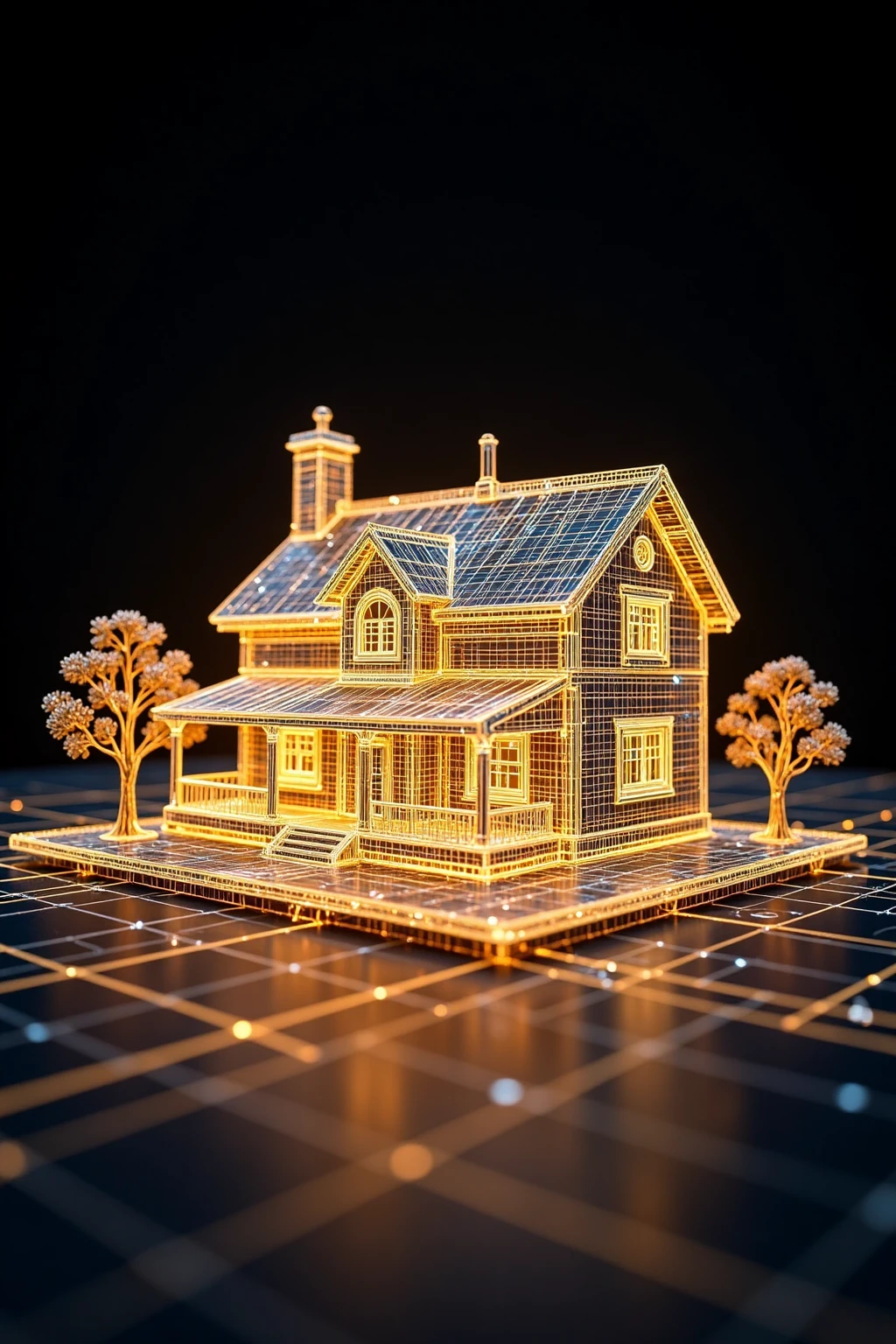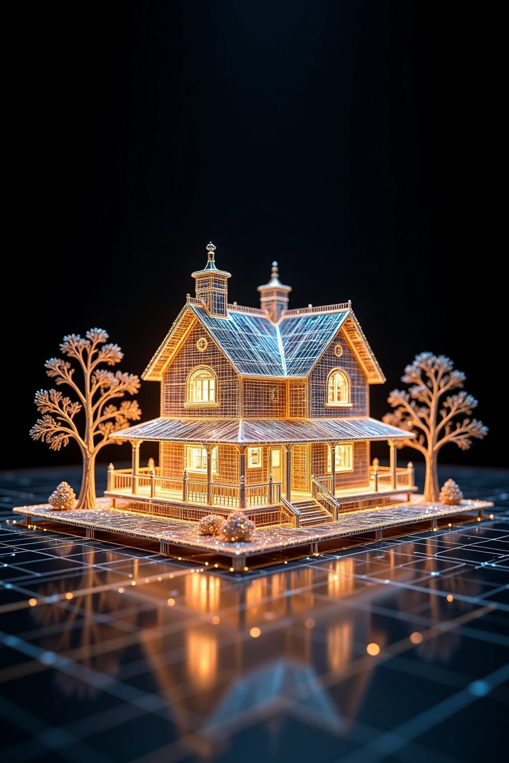 4. 3D wireframe architectural models with glowing effects, depicting a cozy two - story house, warm lights, and small trees.