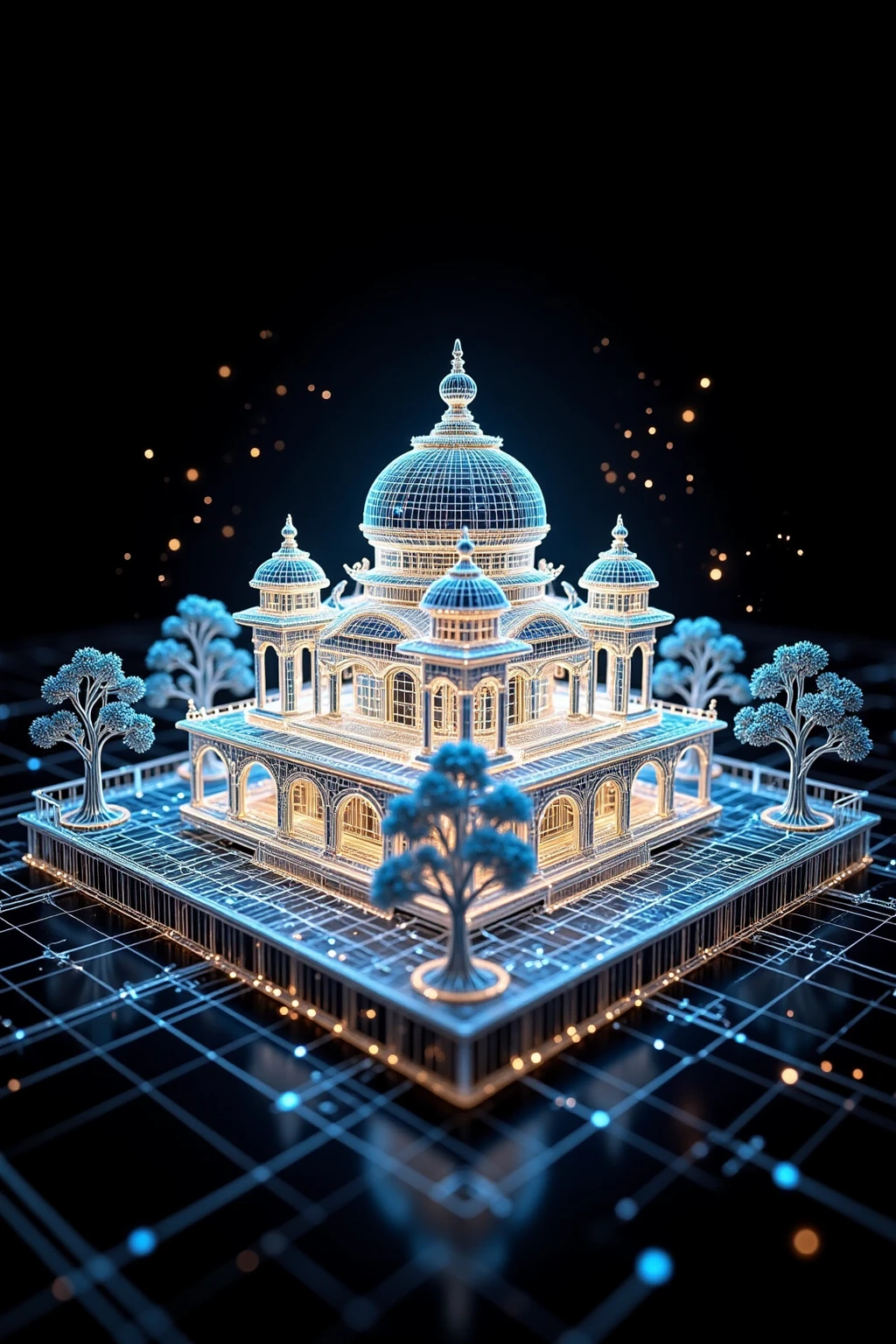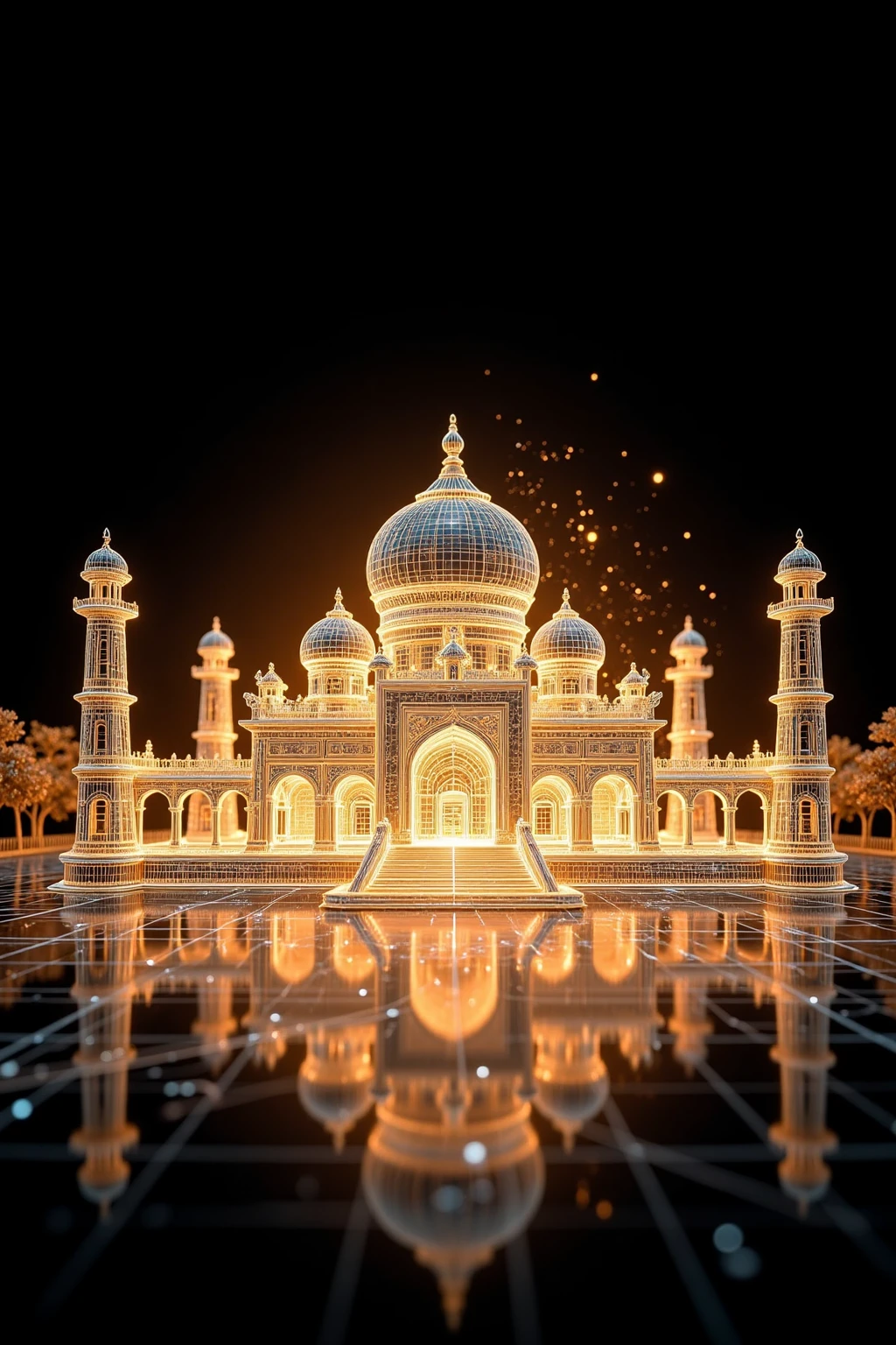 3. 3D wireframe architectural models with glowing effects, presenting a domed palace, golden sparkles, and mirrored water surface.