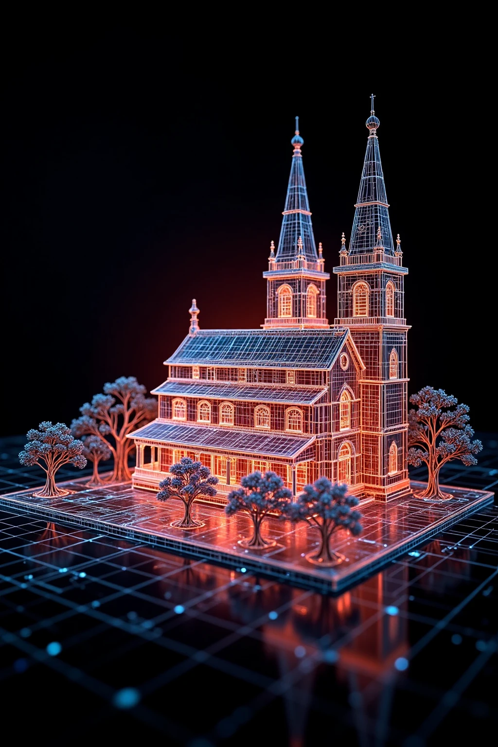 10. 3D wireframe architectural models with glowing effects, including a gothic - style church, red glows, and dark digital grid.