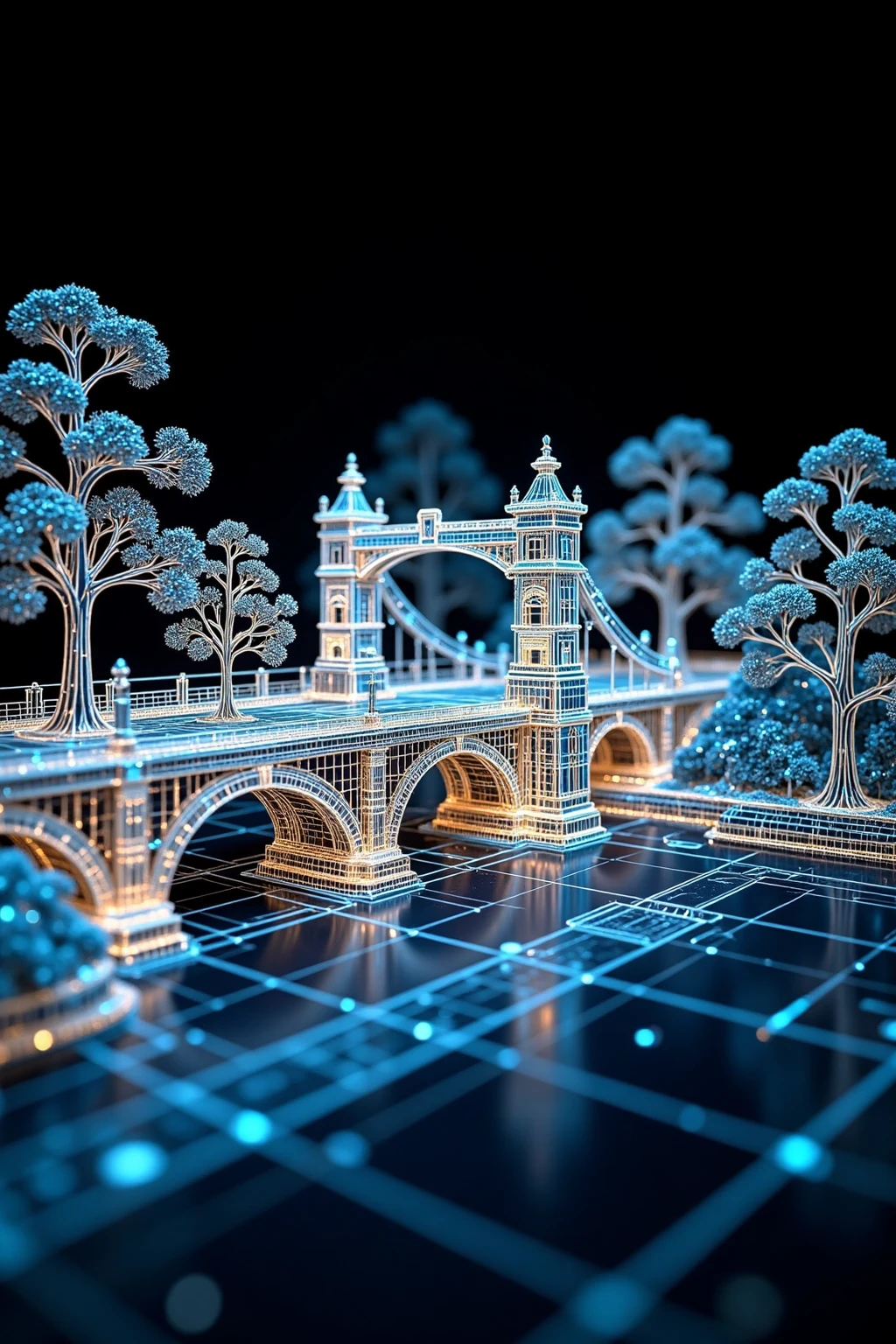 1. 3D wireframe architectural models with glowing effects, featuring a futuristic suspension bridge, neon - lit trees, and digital grid background.