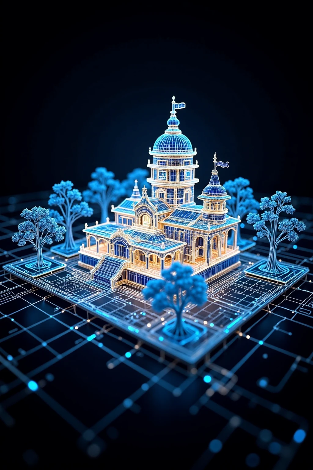 2. 3D wireframe architectural models with glowing effects, showing a grand castle, blue - lit trees, and floating data panels.