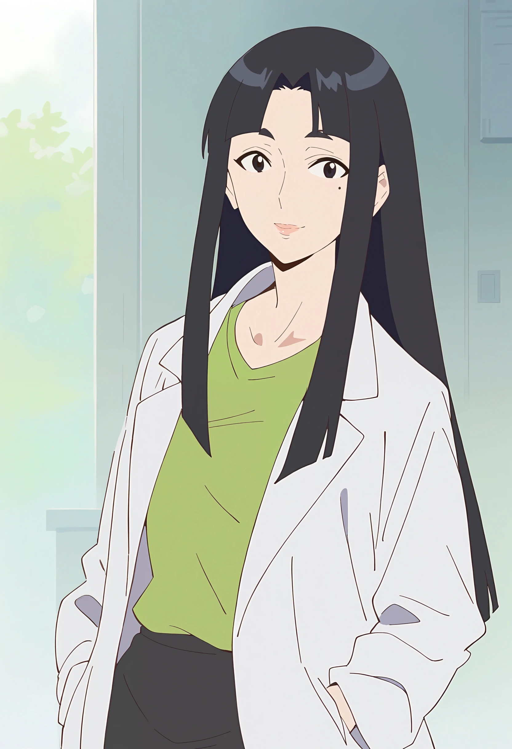 green shirt, labcoat, black skirtThis lora sometimes changes her eye color to brown. Use "black eyes" in this case.