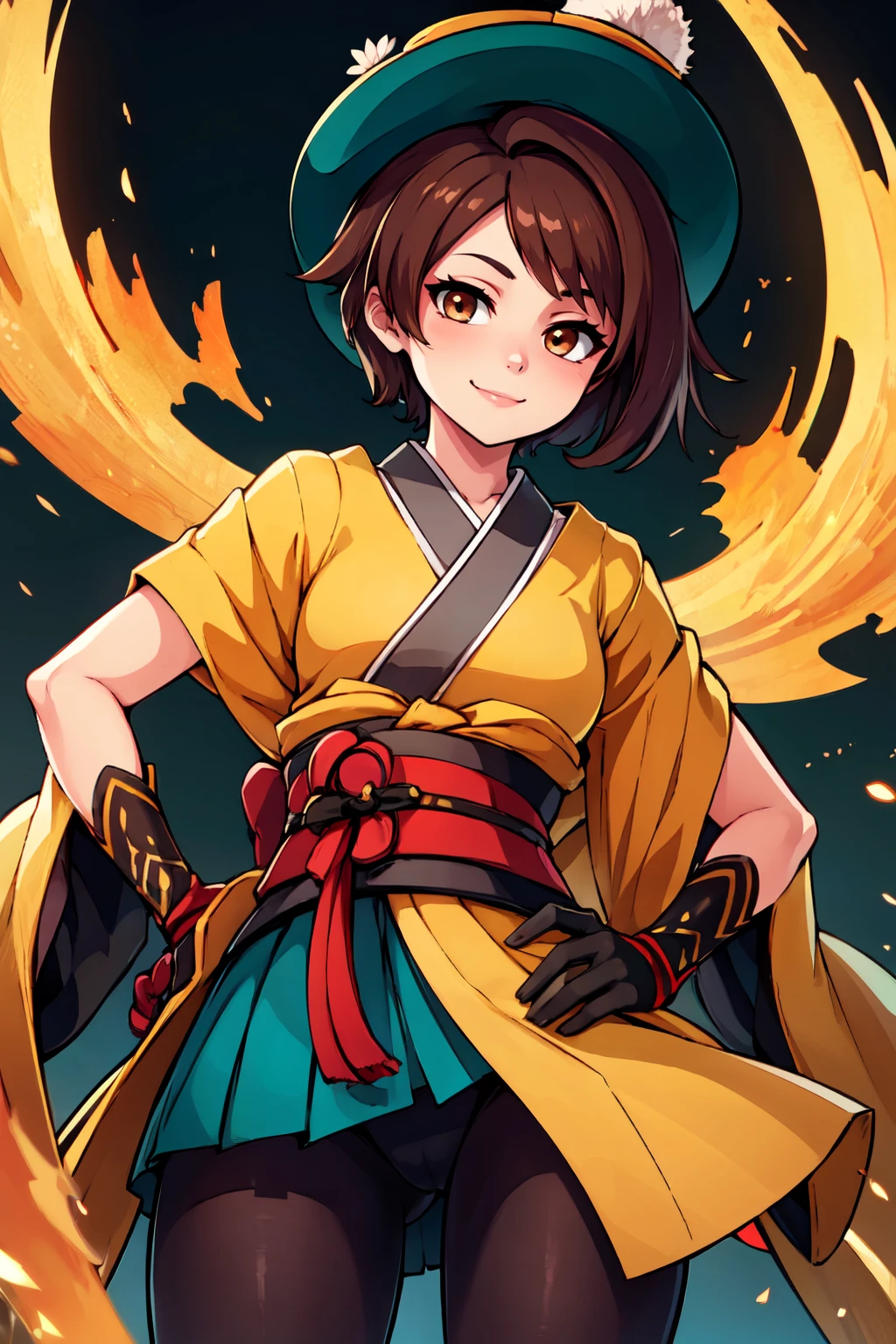 zzgloriachiori, brown eyes, brown hair, japanese clothes, kimono, hair ornament, black gloves,
