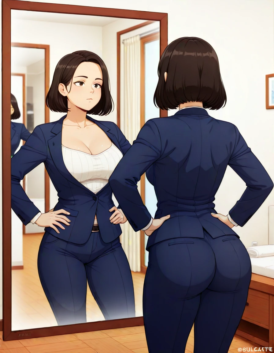 (reflection, looking at mirror, mirror, :1.3) indoors, { bathroom, | bedroom, } __waiartist__ __artist-manga__, pose, curvy,{hands_on_desk | hands up,| hands on own hips, | hand on mirror, } BREAK,1girl, collarbone, breasts, ,BREAK,ass,hips,backDescription