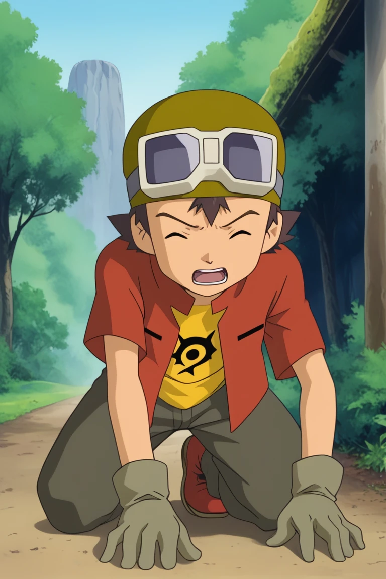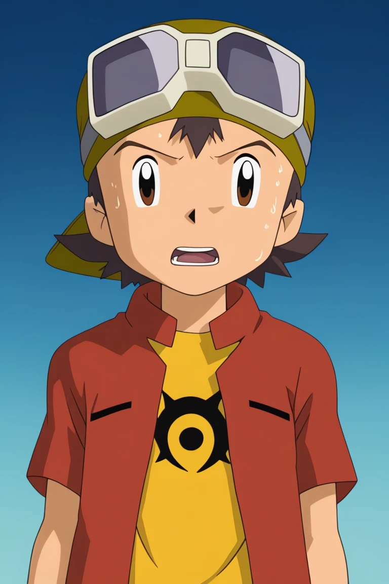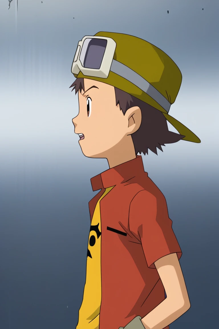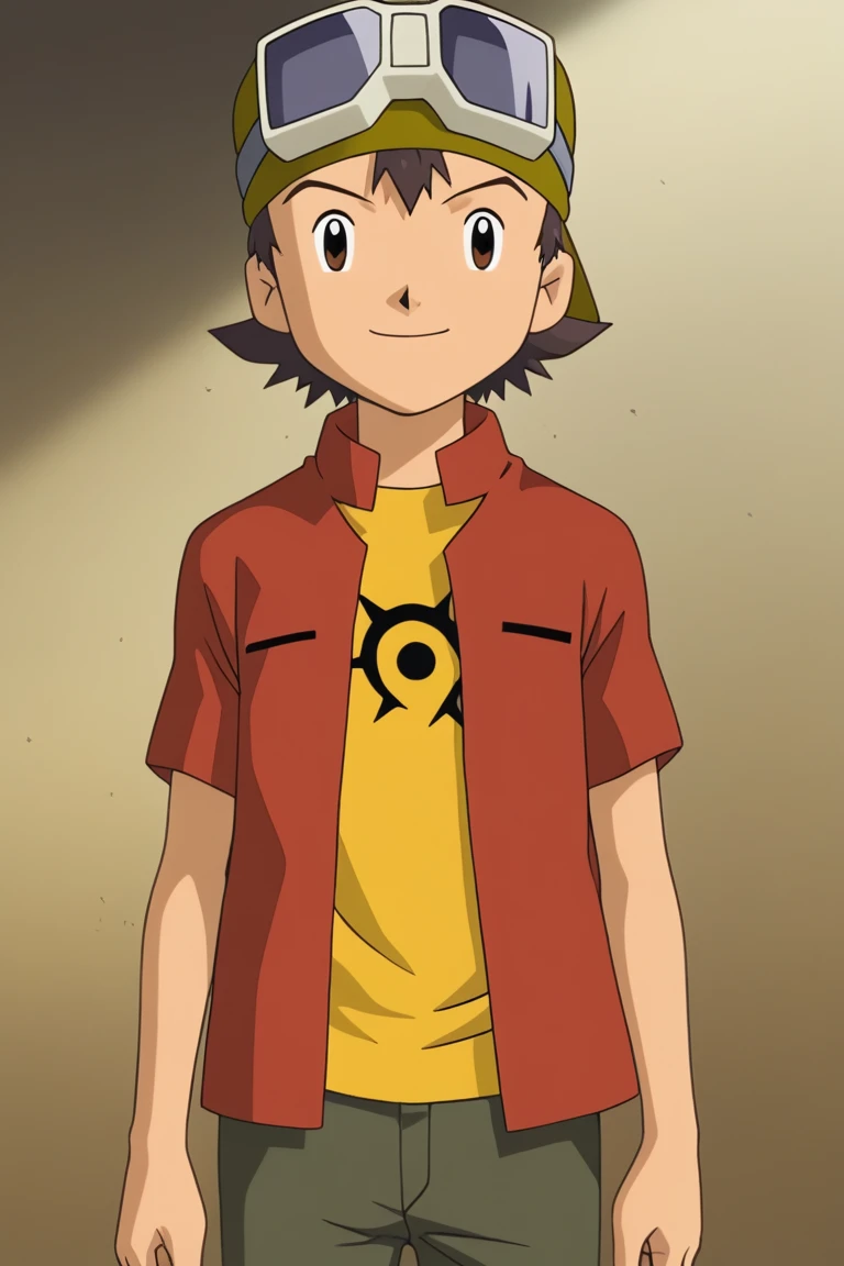 takuya kanbara, brown hair, brown eyes, hat, goggles on head