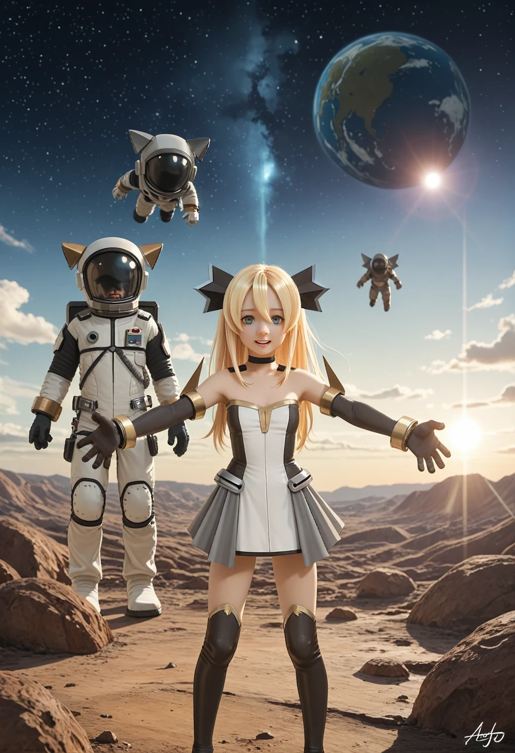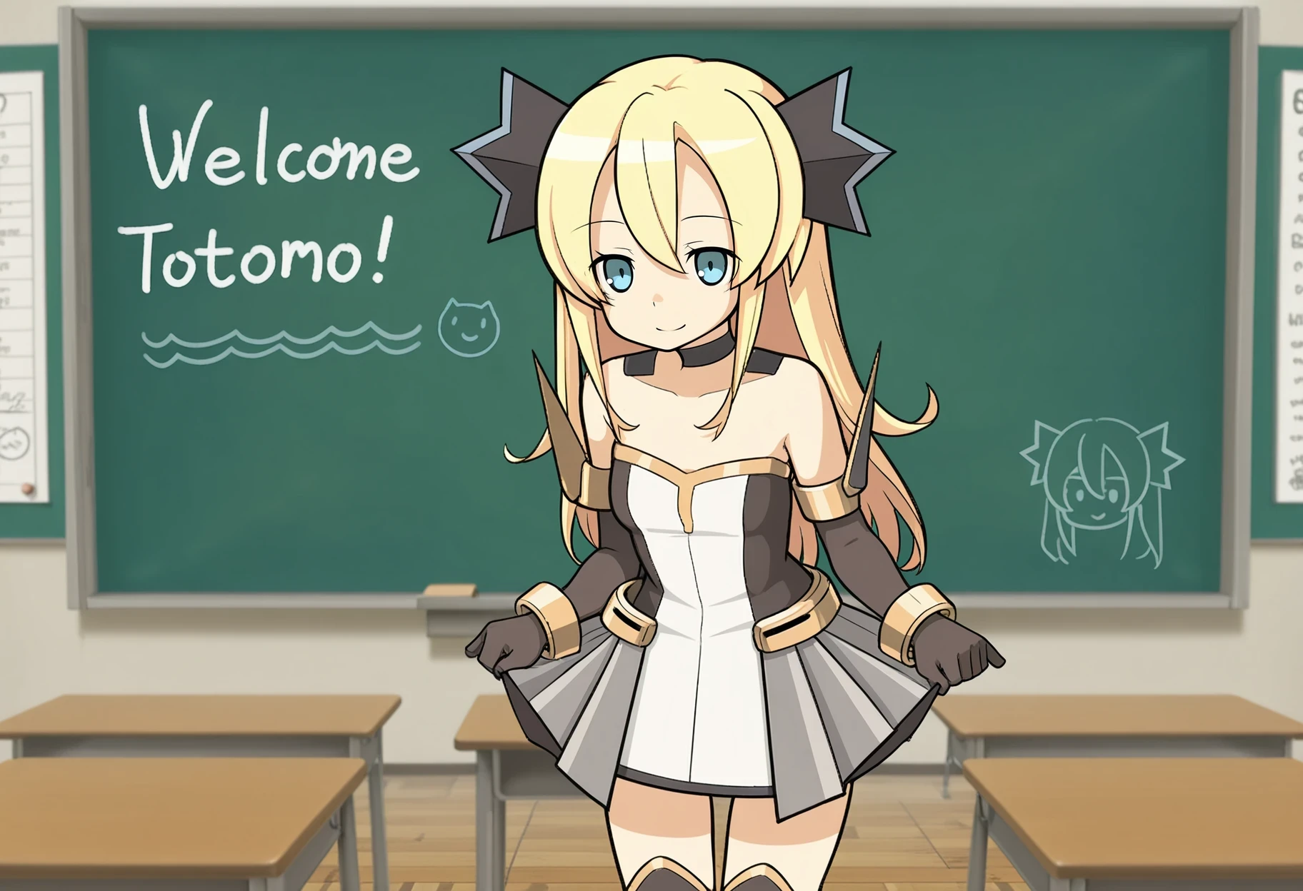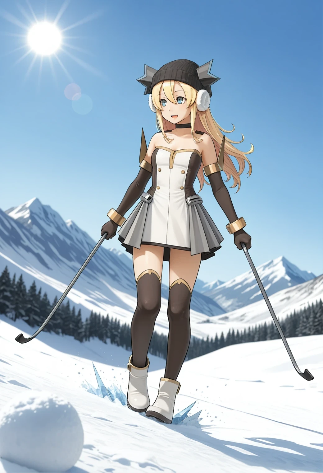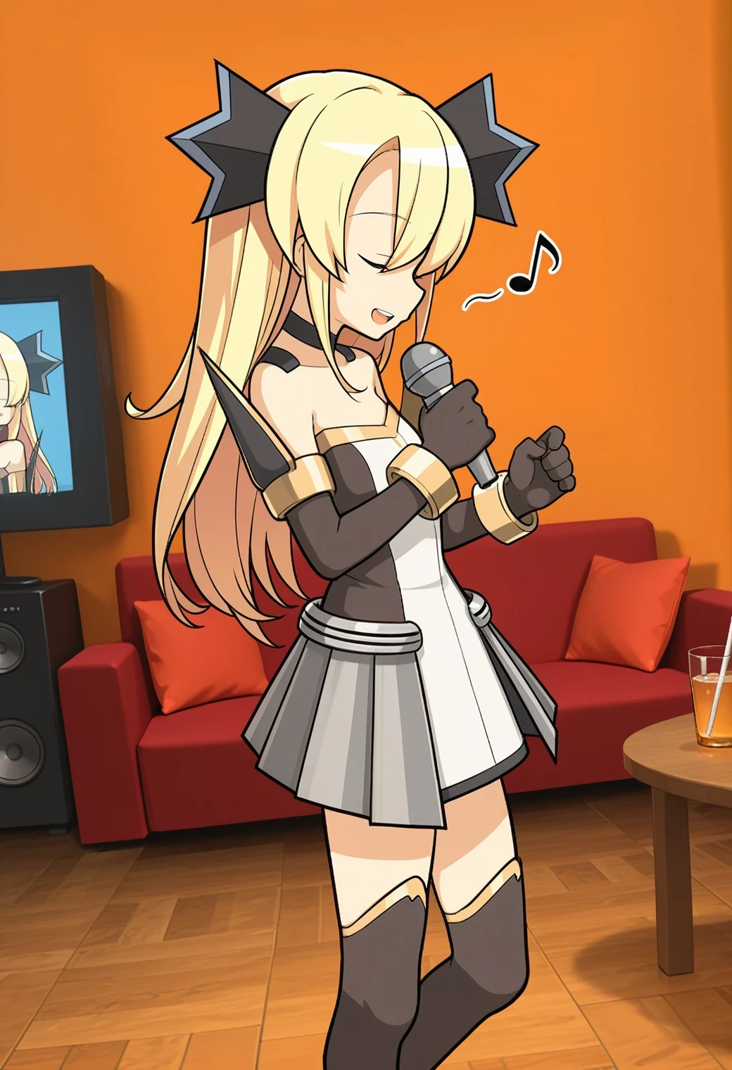 totomono1_Troo, blonde hair, long hair, choker, thighhighs, black thighhighs, gloves, elbow gloves, black gloves, dress, strapless dress, bare shoulders, boots, thigh boots, bracelet, jewelry,