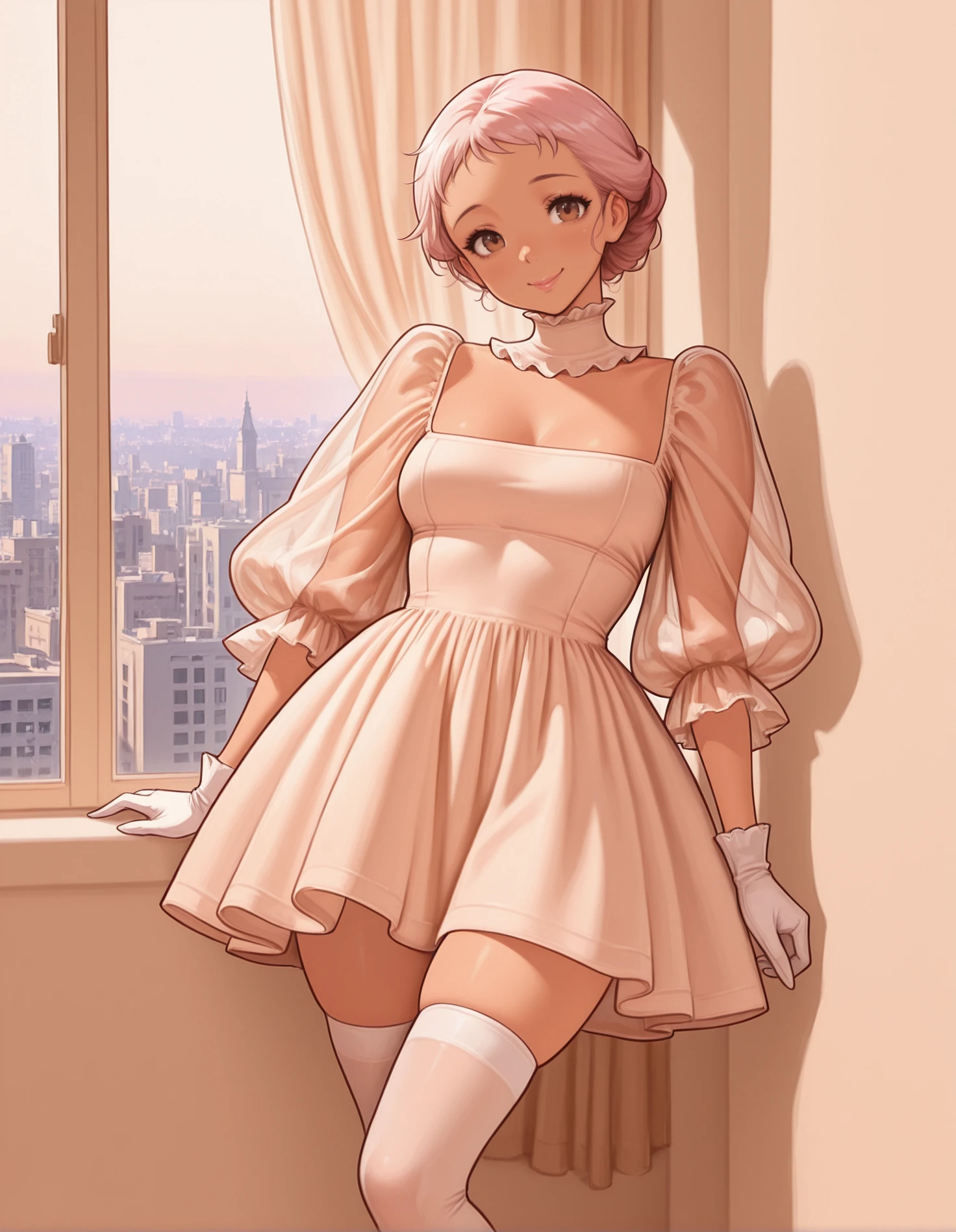 carmelahuerta, beige dress, see-through sleeves, white gloves, white thighhighs