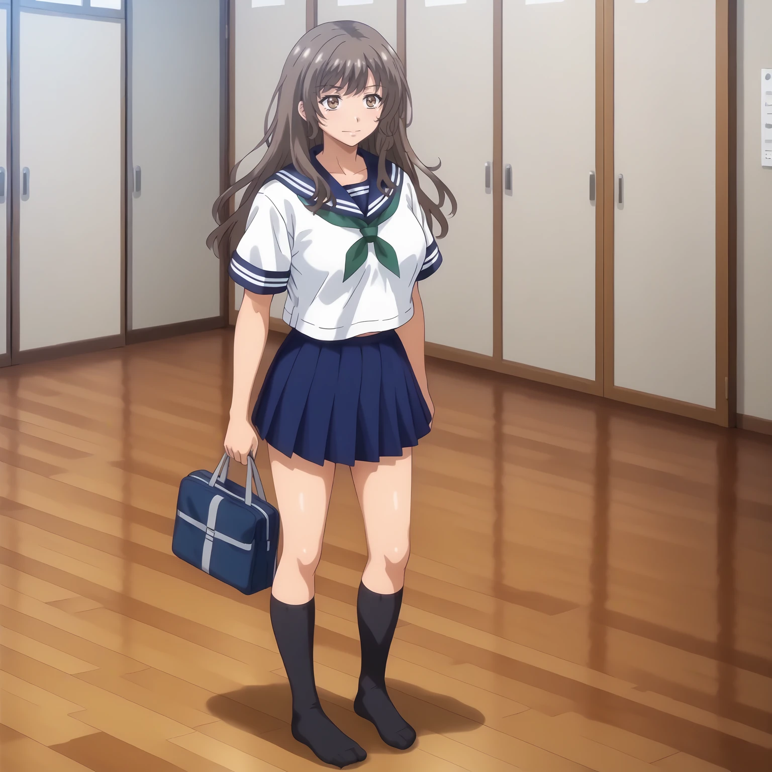 serafuku,white shirt,green_neckerchief,short_sleeves, pleated_skirt,blue skirt, black socks,