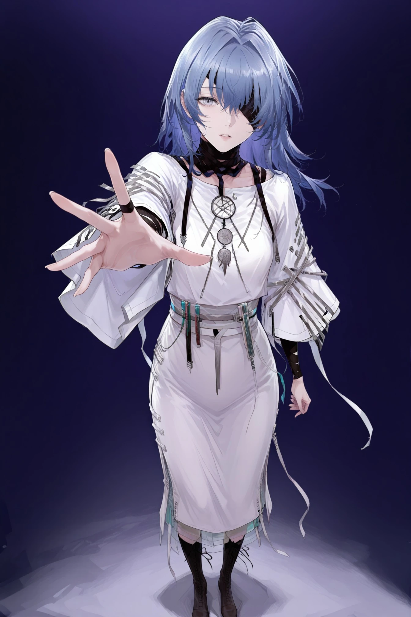hecate \(path to nowhere\), hecate-def, blue hair, long hair, grey eyes,hair between eyes, black bandages, bandage over one eye, bandaged neck, jewelry, white dress, wide sleeves, bandaged wrist, black footwear, boots, pen,
