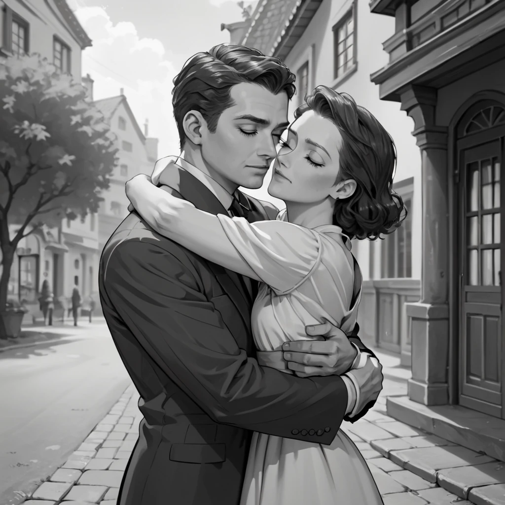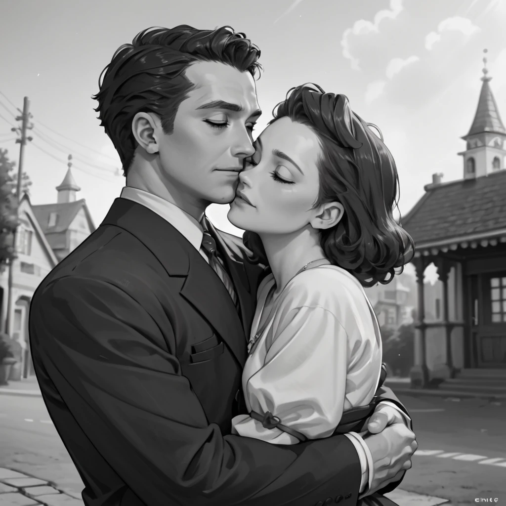 hud_40s_lv, monochrome, greyscale, 1girl, 1boy, suit, dress, hug, film grain, cinematic