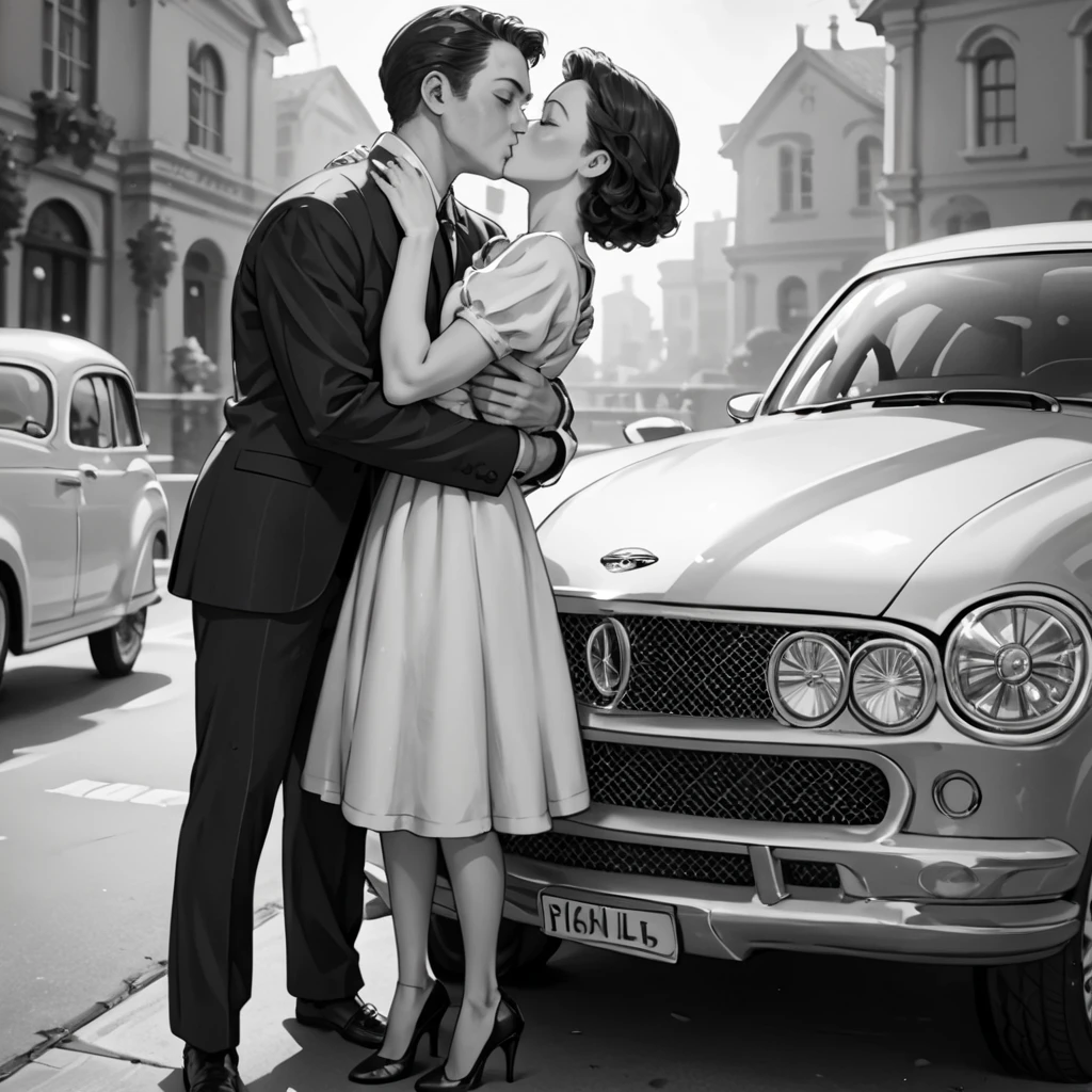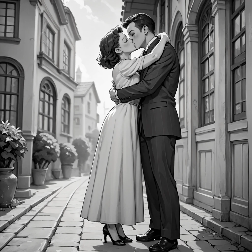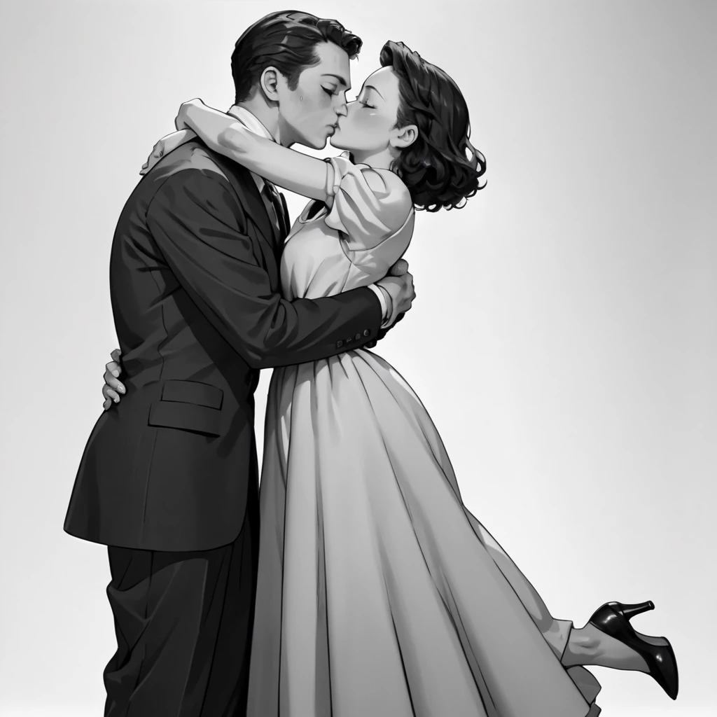FULL BODY, HUD_40S_LV, MONOCHROME, GREYSCALE, 1GIRL, 1BOY, HUG, KISS, SUIT, DRESS, HIGH HEELS, SIMPLE BACKGROUND, FILM GRAIN, CINEMATIC