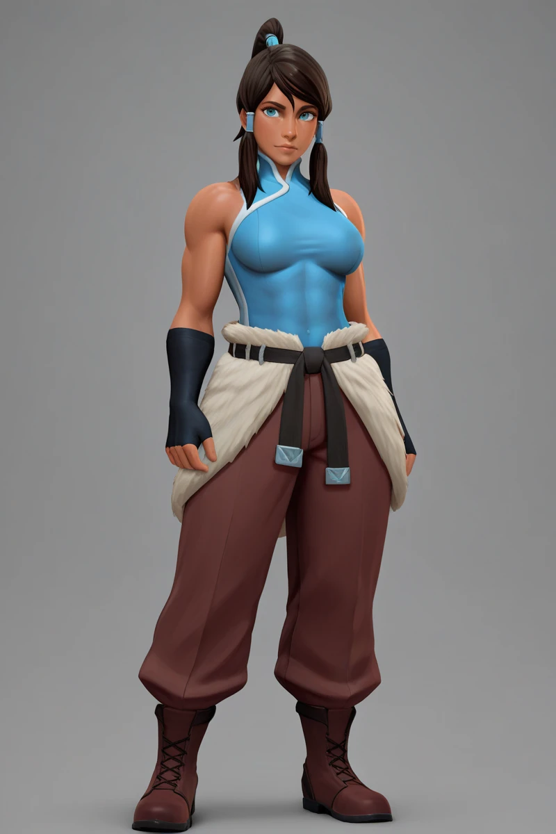 cr1s1be4t_korr4, not furry, 3D, female, solo, brown skin, brown body, athletic female, blue eyes, brown hair, medium hair, hair tubes, blue accessory, high ponytail, swept bangs, hair on shoulders, long bangs, ,