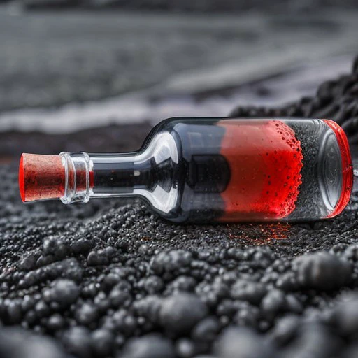 laying on its side transparent red bottle on stony ground, background lava spewing volcano, <lora:EmptyGlassBottleConcept:0.75>First one describes the bottle a little bit and second one describes the background more or less in detail. Then one has a good base concept.