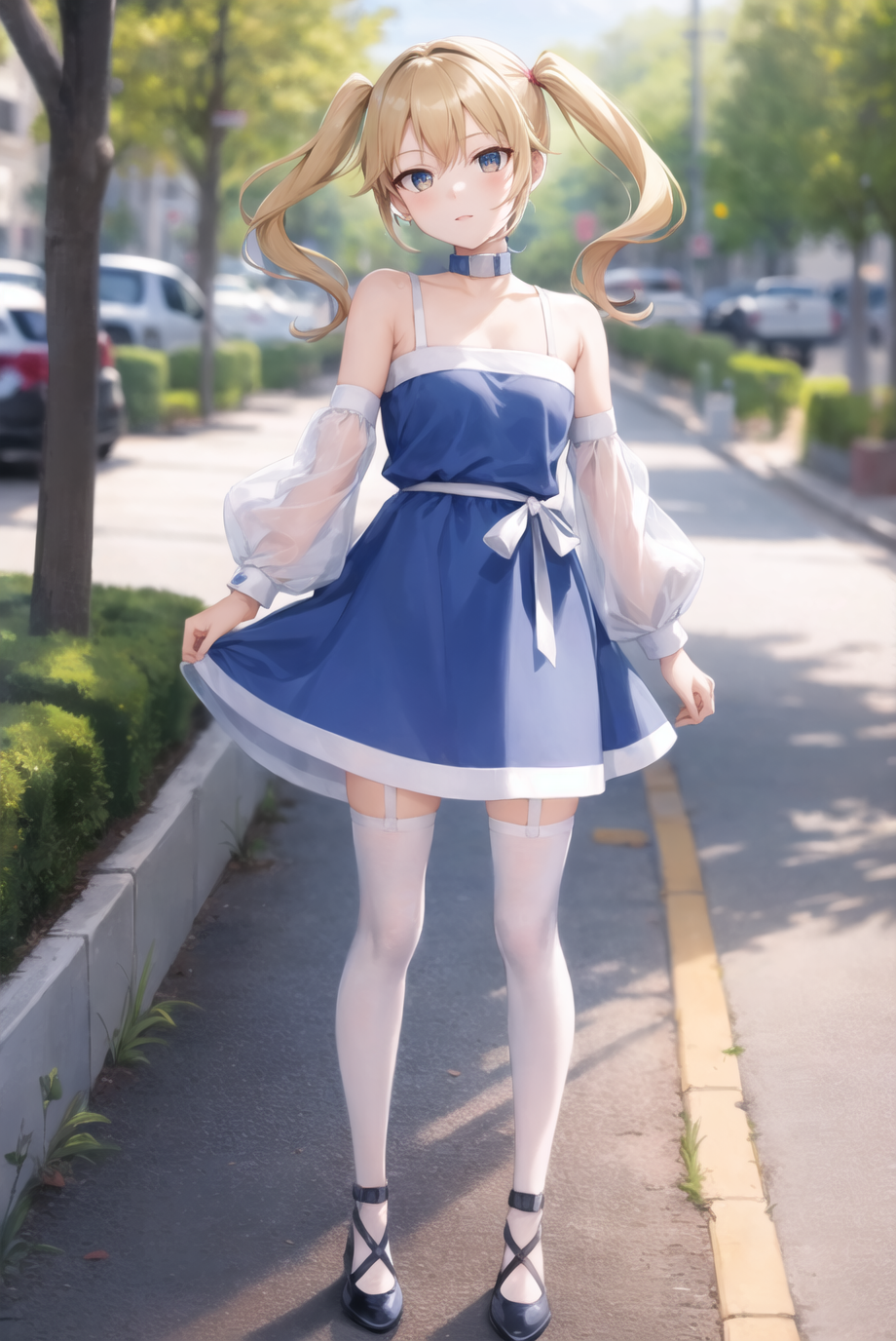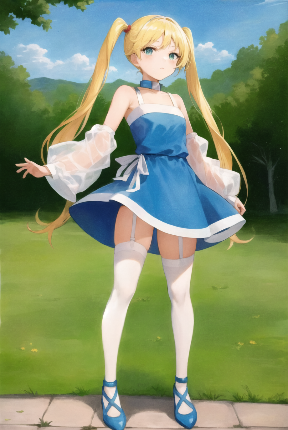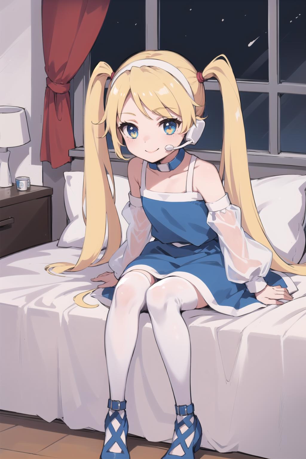 Optional items include: twintails, blue dress, detached sleeves, collar, white thighhighs, garter straps, headset. Occasionally, things from the list may bleed into generations, especially her collar, so add into negatives as needed.