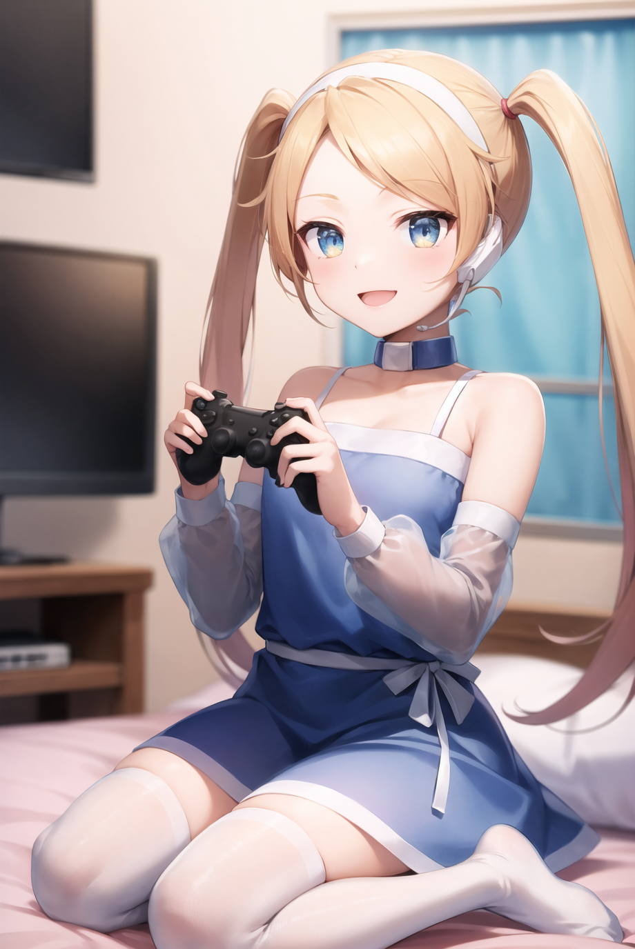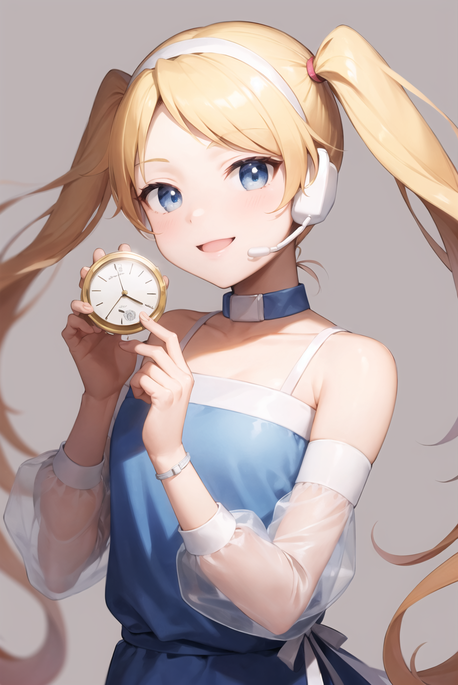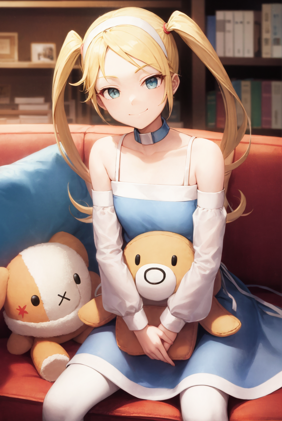 Optional items include: twintails, blue dress, detached sleeves, collar, white thighhighs, garter straps, headset. Occasionally, things from the list may bleed into generations, especially her collar, so add into negatives as needed.