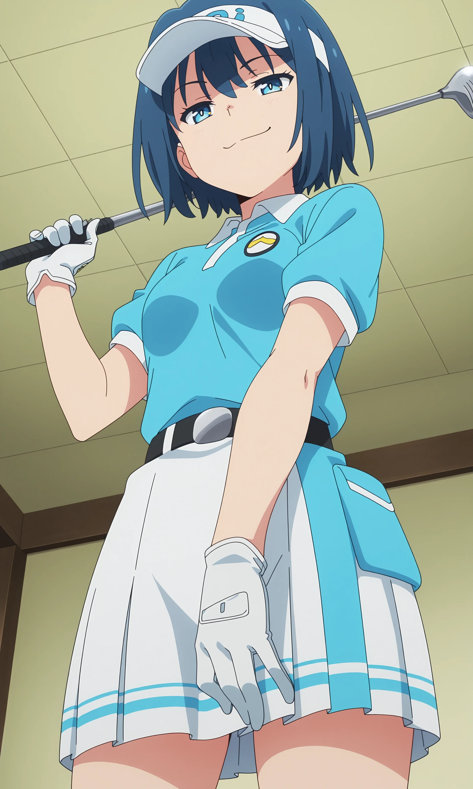 skirt, white gloves, white skirt, blue shirt, visor cap, white socks, shoes, pleated skirt, belt, black footwear, short sleeves, polo shirt, smile, kneehighs,