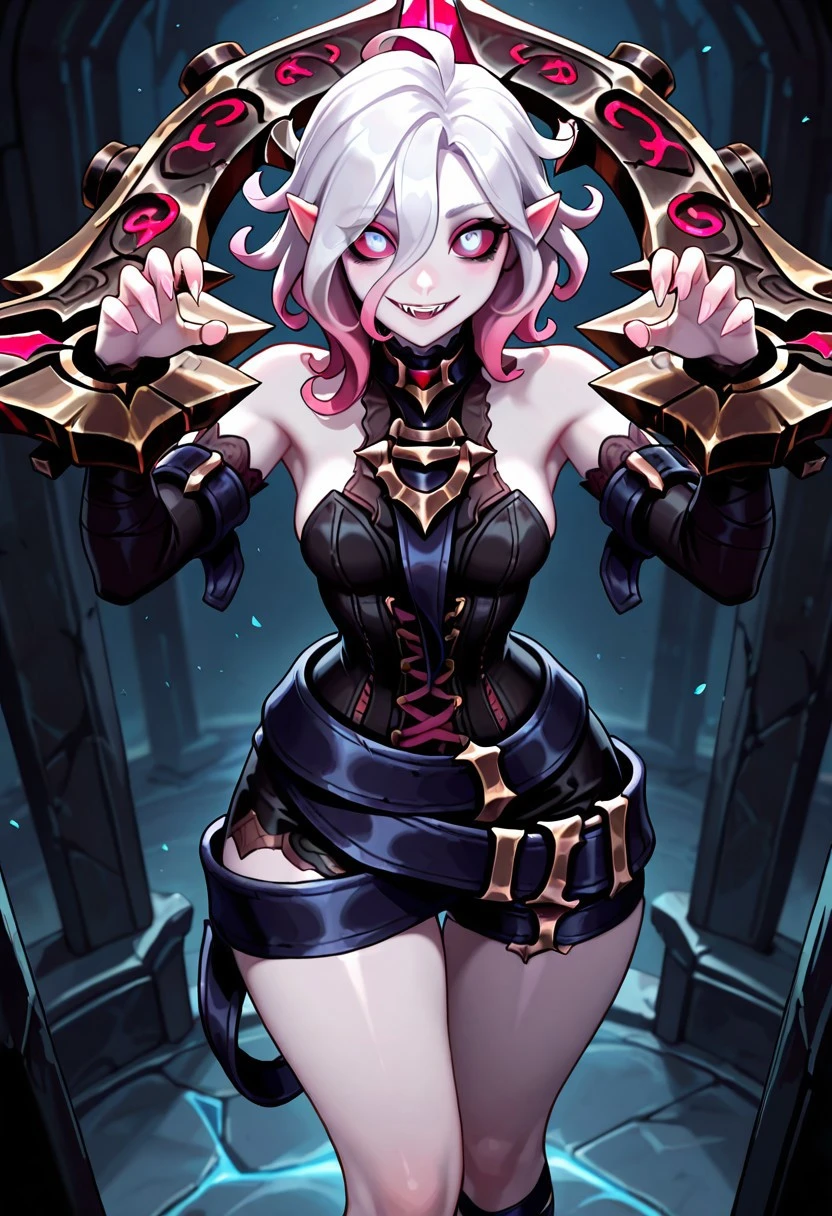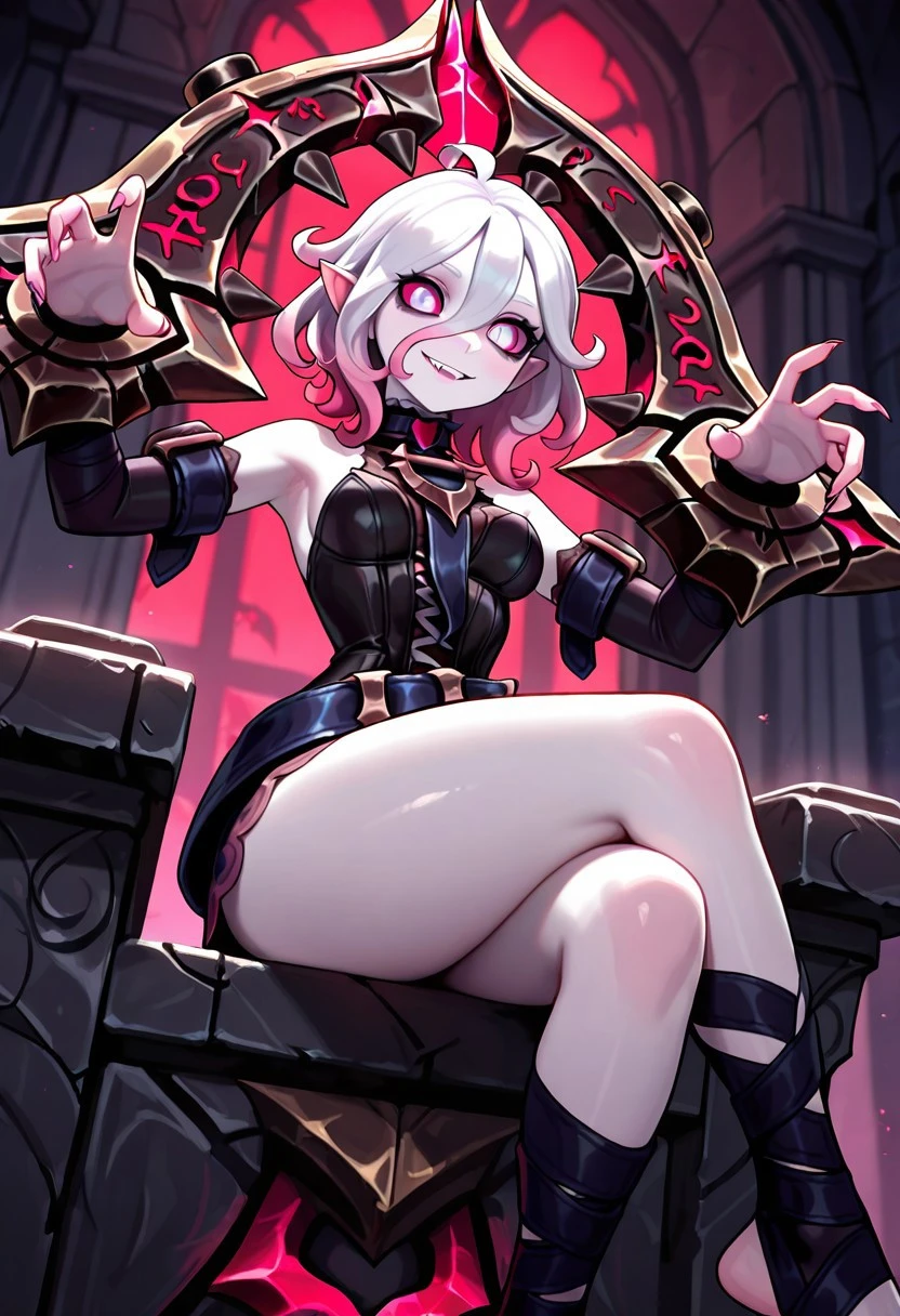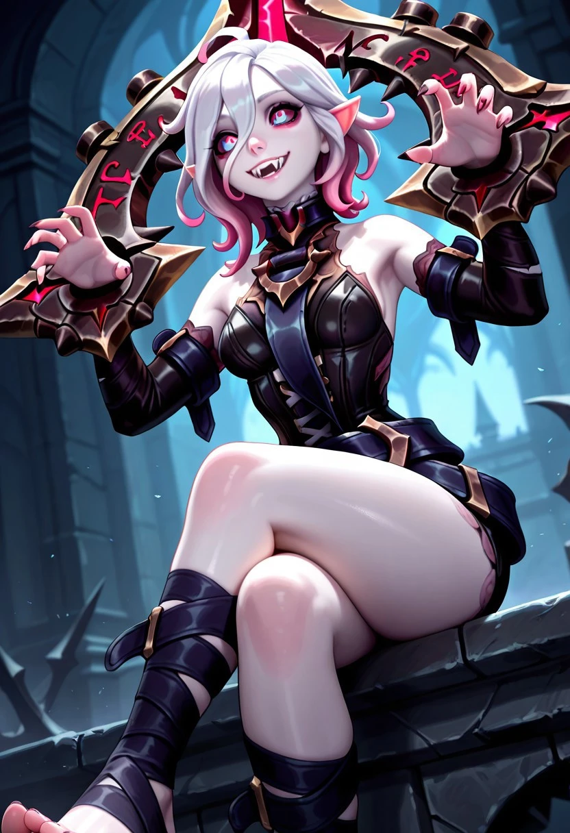 briar, league of legends, multicolored hair, gradient hair, pointy ears, hair over one eye, pink hair, red sclera,